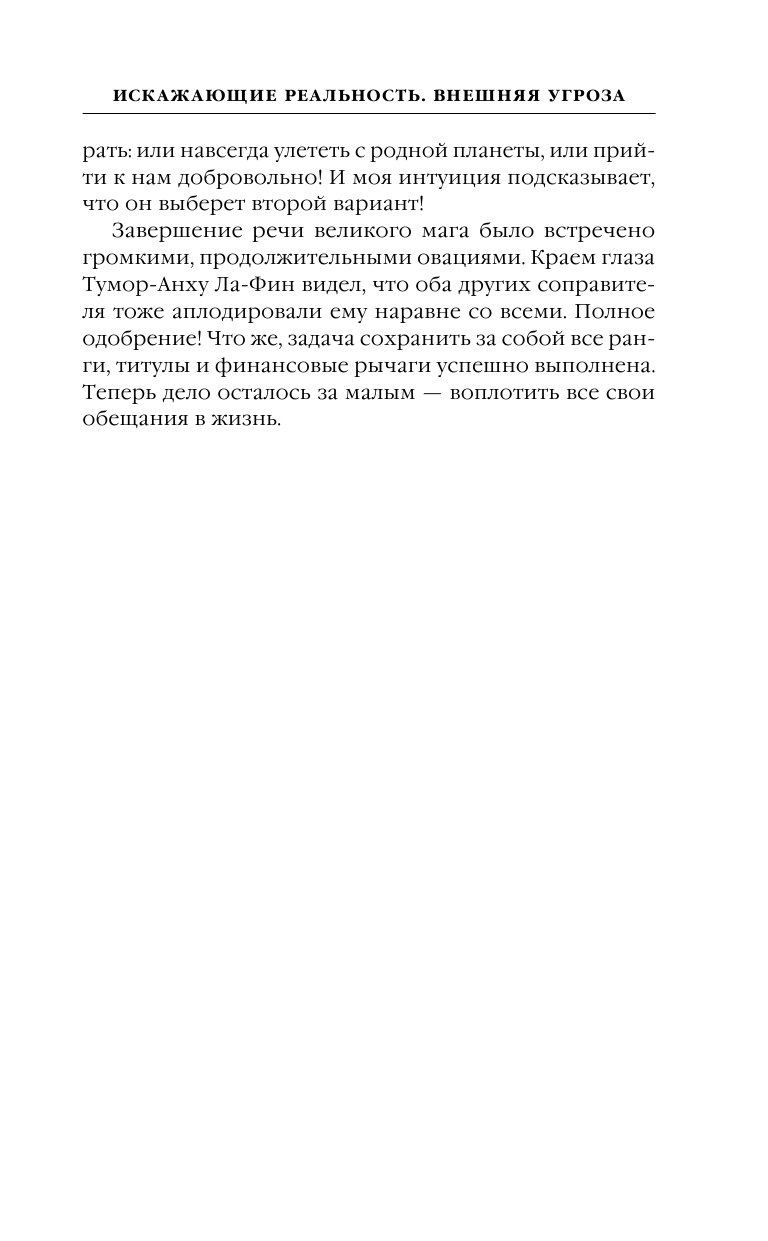 "Внешняя угроза" - вторая книга серии "Искажающие реальность" - раскрывает перед читателем становление главного героя повествования, который продолжает постоянно развиваться, находит нестандартные и неожиданные выходы из различных ситуаций, но, несмотря на это, взлеты чередуются падениями, а на место дружбы приходит предательство. Автор сделал сюжет произведения очень динамичным и непредсказуемым, наполнив его многочисленными поворотами, что не дает оторваться от чтения.