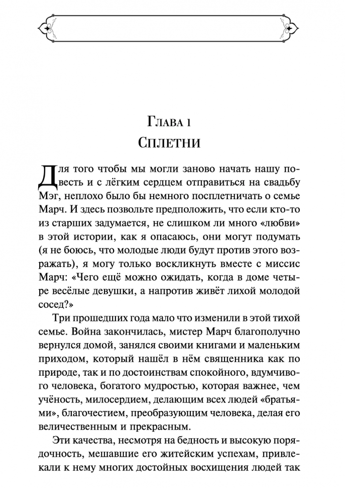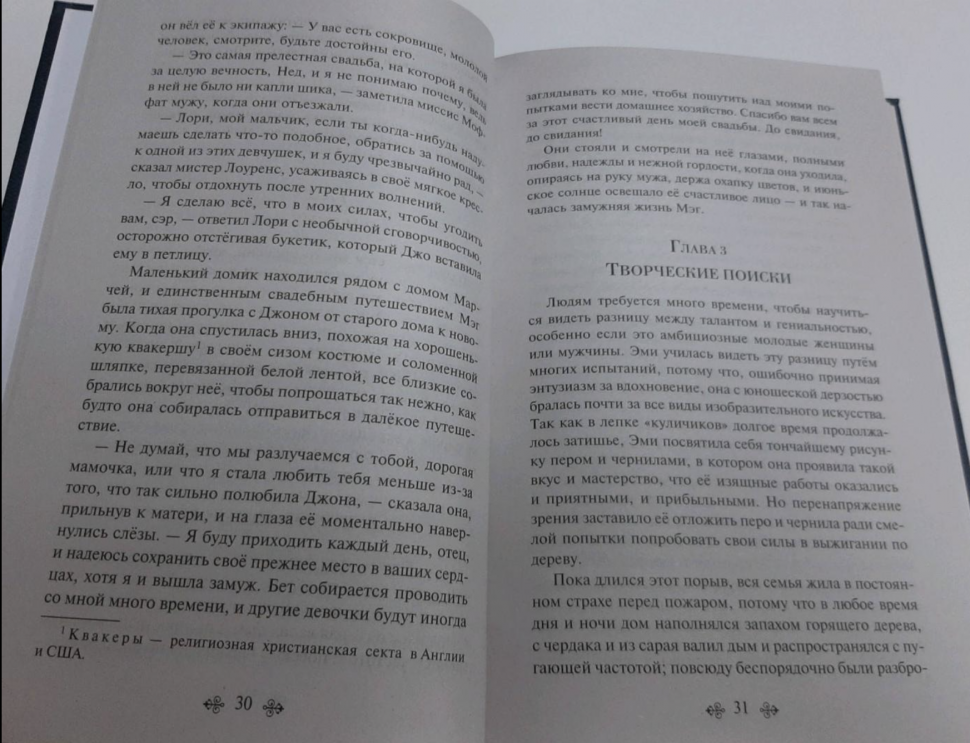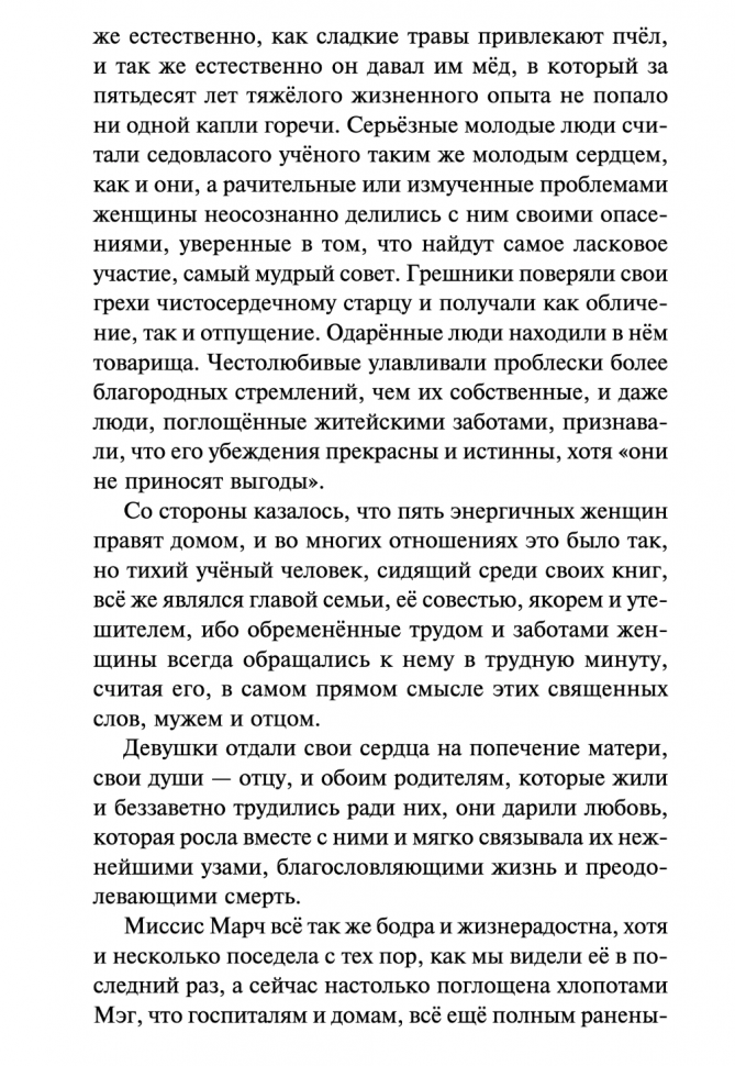 Снова восхитительно!Очень достойное продолжение Маленьких женщин, от которых я осталась в полном восторге. Эта часть взрослее, серьезнее, но сохранила ту же теплоту что и первая книга. Самое главное дикларирует ту же мораль и те же ценности! Будет очень полезна подросткам и молодым девушкам, чтобы понимать как стоит выстоаивать отношения не