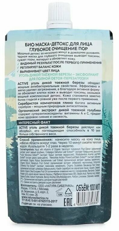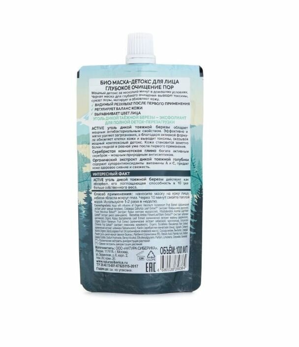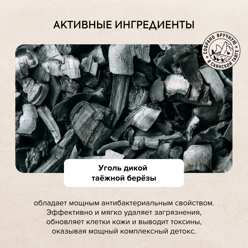 Active уголь дикой таежной березы обладает мощным антибактериальным свойством. Эффективно и мягко удаляет загрязнения, а благодаря активной формуле обновляет клетки кожи и выводит токсины, оказывая мощный комплексный детокс. Кожа становится заметно более гладкой и ровной уже после первого применения. Серебристая камчатская глина богата активным серебром - мощным природным антисептиком. Органический экстракт дикой таежной голубики содержит супер антиоксиданты витамины А и С, придает коже здоровое сияние и свежесть.