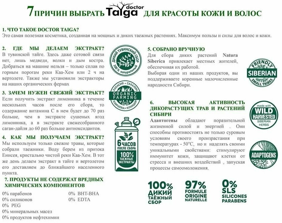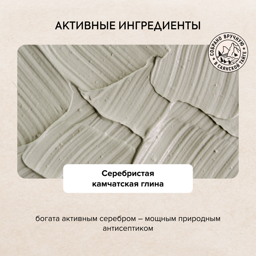 | Химический состав | Aqua with infusions of Organic Vaccinium Vulcanorum Fruit Extract (органический экстракт дикой таежный голубики), Crataegus Dahurica Leaf ExtractWH (экстракт боярышника даурского), Fucus Vesiculosus ExtractWH (экстракт бурых охотских водорослей), Rhododendron Adamsii Leaf/Stem ExtractFE (экстракт дикого саган-дайля), Hierochloe Arctica Flower/Leaf/Stem ExtractWH (экстракт зубровки арктической), Organic Rubus Sachalinensis Leaf Extract (органический экстракт малины сахалинской), Organic Silybum Marianum Fruit Extract (органический экстракт сибирского чертополоха), Schizandra Chinensis Fruit ExtractFE (экстракт лимонника нанайского), Organic Scutellaria Baicalensis Root Extract (органический экстракт шлемника байкальского); Kaolin (серебристая камчатская глина), Glycerin, Cetearyl Alcohol, Organic Olea Europaea Fruit Oil (органическое оливковое масло), Cocoglycerides, Bentonite, Charcoal Powder (уголь дикой черной таежной березы), Panthenol (провитамин B5), Stearic Acid, Palmitic Acid, Sodium Cetearyl Sulfate, Sodium Hydroxide, Benzyl Alcohol, Ethylhexylglycerin, Parfum, Limonene, Citronellol, Geraniol |