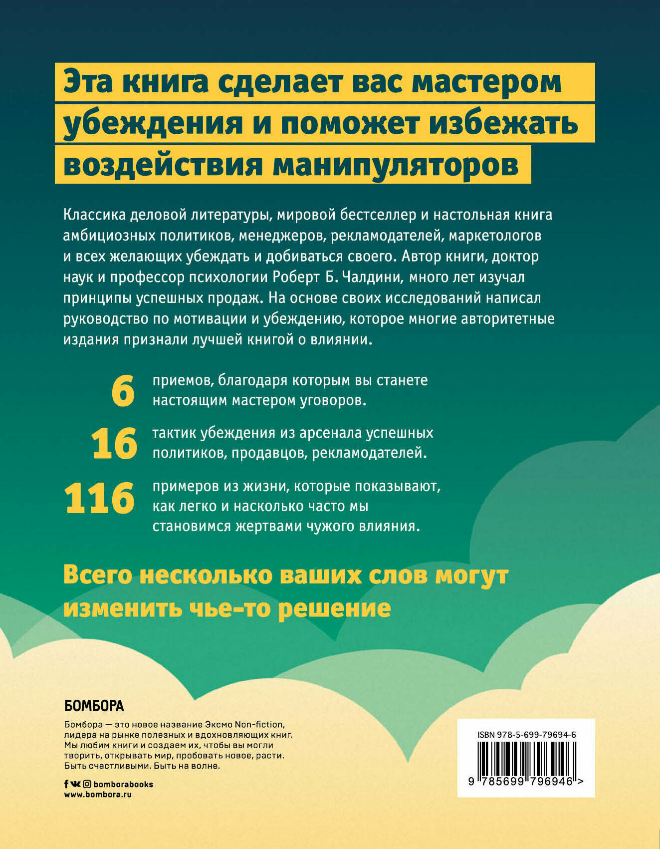 КЛАССИКА ДЕЛОВОЙ ЛИТЕРАТУРЫ В СОВРЕМЕННОМ ПРОЧТЕНИИ. КНИГА ПЕРЕВЕДЕНА НА 44 ЯЗЫКА. ВХОДИТ В ТОП-100 ЛУЧШИХ КНИГ AMAZON. Роберт Чалдини, доктор наук и профессор психологии, расширил свои идеи в новой версии мирового бестселлера. Он переработал классический текст, добавив методы и кейсы влияния в интернет-пространстве. Скрытые механизмы воздействия на подписчиков соцсетей, мягкие манипуляции инфобизнесменов и хитрые ловушки, которые расставляют производители приложений, — все это подробно анализирует автор «Психологии влияния». Книга обязательна к прочтению поклонникам исходной версии бестселлера, а также маркетологам, блогерам, журналистам, менеджерам по продажам, политикам, предпринимателям, психологам и тем, кто не хочет ни при каких условиях становиться жертвой манипуляций.