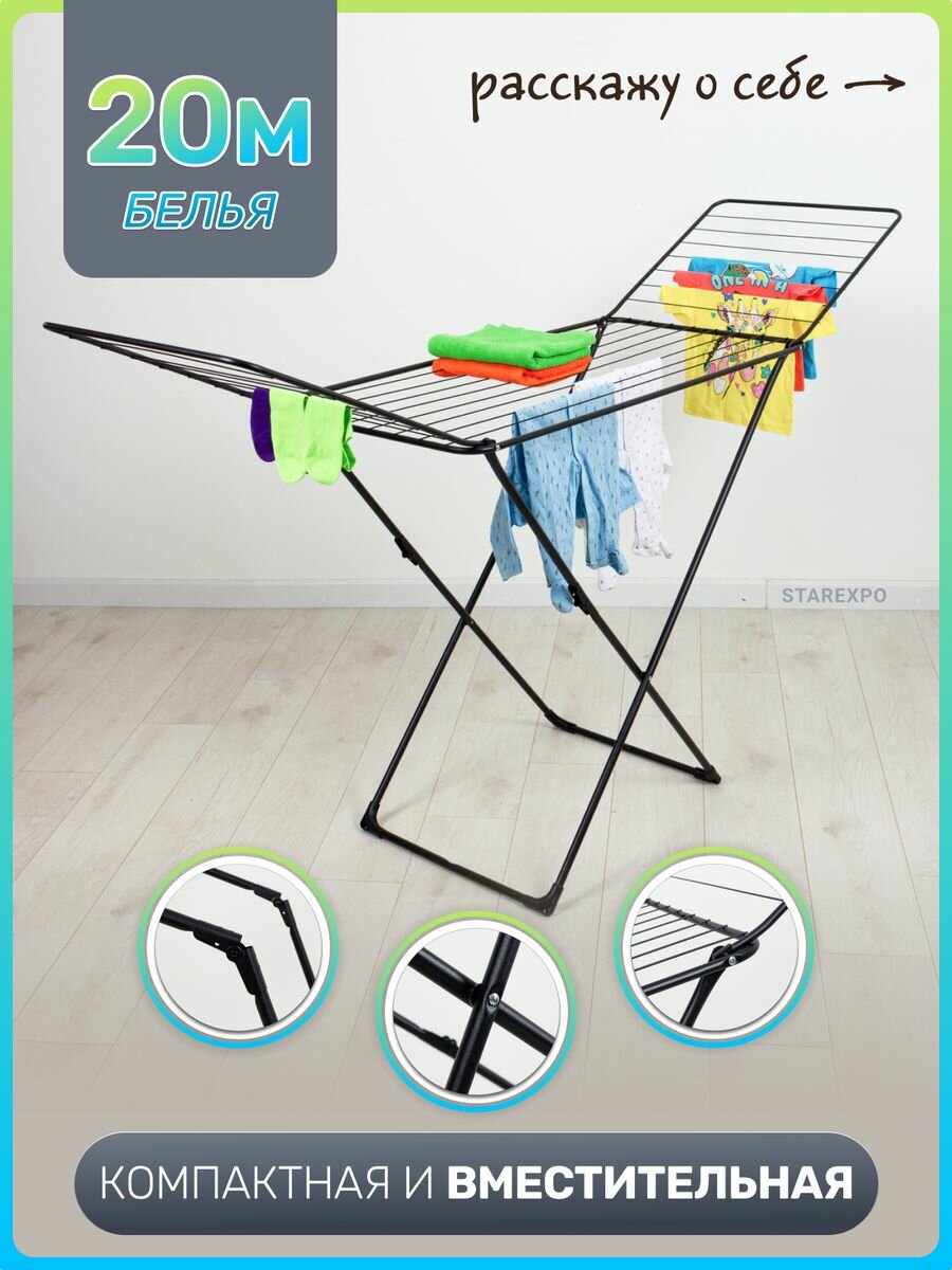 Складная сушилка для белья с распашными створками. Преимущества: стальные струны с антикоррозийным покрытием, пластмассовые наконечники для дополнительной устойчивости, удобный механизм складывания, подходит для использования в любых помещениях и на открытом воздухе, при необходимости боковые детали сушилки можно сложить «домиком» и сушить трикотажные вещи, длина сушильного полотна 20м, максимальная нагрузка не более 17 кг. Габаритные размеры: в разложенном виде (ДхШхВ): 1970х535х1110мм / в сложенном виде (ДхШхВ): 1300х535х40мм
