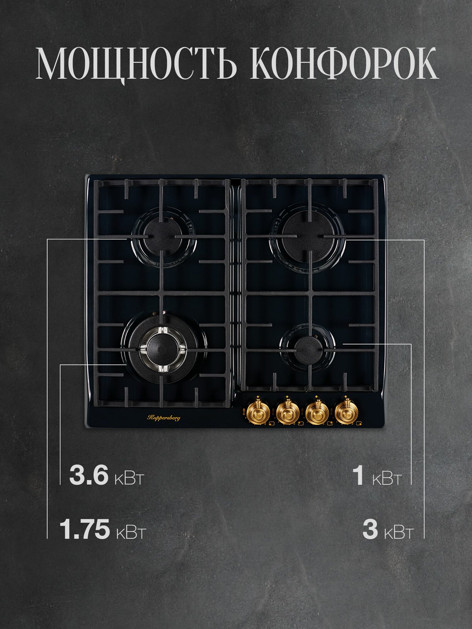 | Описание конфорок | Мощность передней левой конфорки 3,1 кВт. Мощность передней правой конфорки 1,0 кВт. Мощность задней левой конфорки 1,75 кВт. Мощность задней правой конфорки 2,8 кВт. Конфорок газовых 4. Конфорок тройная корона 1. |