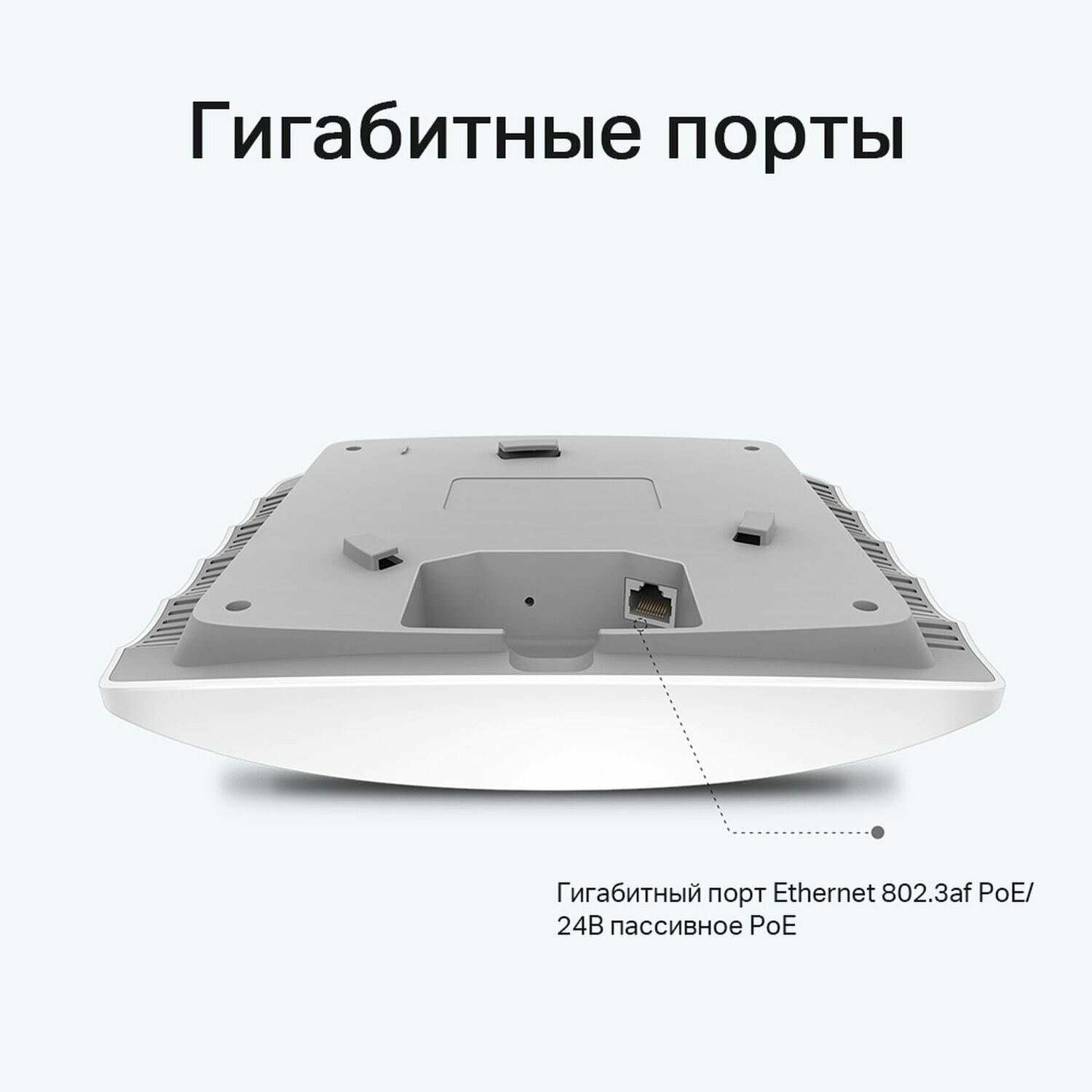 | Дополнительная информация | Беспроводная двухдиапазонная гигабитная потолочная точка доступа,,Скорость до 1200 Мбит/с в двух диапазонах:до 300 Мбит/с на 2,4 ГГц и до 867 Мбит/с на 5 ГГц ,Программное обеспечение EAP Controller для лёгкого управления множеством точек доступа,Поддержка Power over Ethernet (802.3af) для удобного размещения и подачи питания,Портал аутентификации гостей в сети Wi-Fi,Функция Band Steering автоматически переключает двухдиапазонные устройства на канал 5 ГГц для более быстрого подключения |