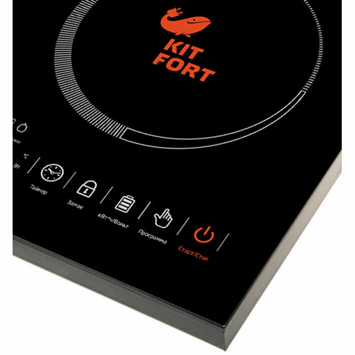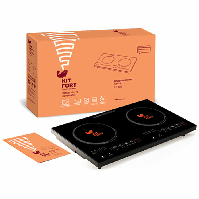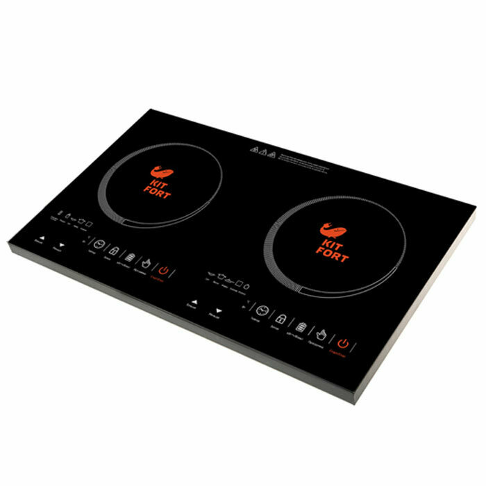 Kitfort — двухконфорочная индукционная настольная плита с сенсорным управлением. Это довольно серьезный агрегат: по характеристикам и мощности он не уступает «взрослой» плите, а по сути — ею и является. имеет немалые размеры, эта не та плитка, которую удобно носить с собой под мышкой и ставить где придется. При желании модель можно даже встроить в кухонный гарнитур.
