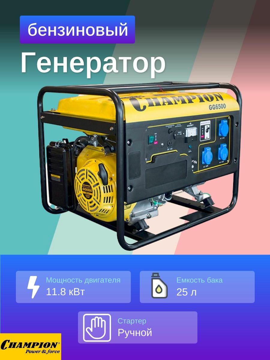 Бензиновый генератор Чемпион () Современный бензиновый генератор является полупрофессиональной моделью. Такой агрегат можно использовать в быту, в офисе и в магазинах. Также к нему можно подключать различные инструменты (строительные/садовые). Это устройство снабдит вас электричеством на продолжительный период времени. Вот его основные преимущества и особенности: Прочная рама надежно фиксирует корпус и увеличивает износостойкость агрегата.
