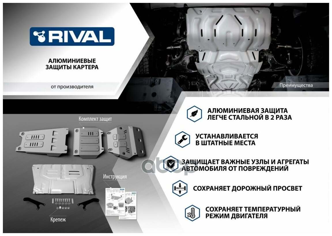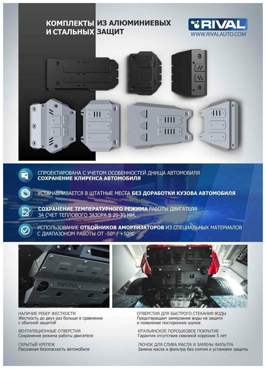 Алюминиевые защиты Rival надежно защищают днище вашего автомобиля от повреждений, например при наезде на бордюры, а также выполняют эстетическую функцию при установке на высокие автомобили.