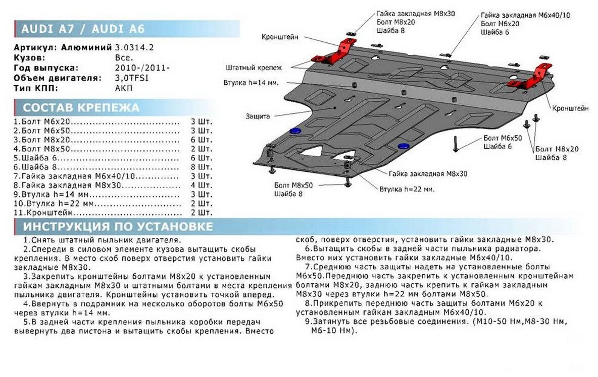 Защита картера и КПП Rival Audi A6 2011, V-3.0Audi A6 Allroad 2012, V-3.0Audi A7 2010, V-3.0, алюминий 4 мм., комплект крепежа,