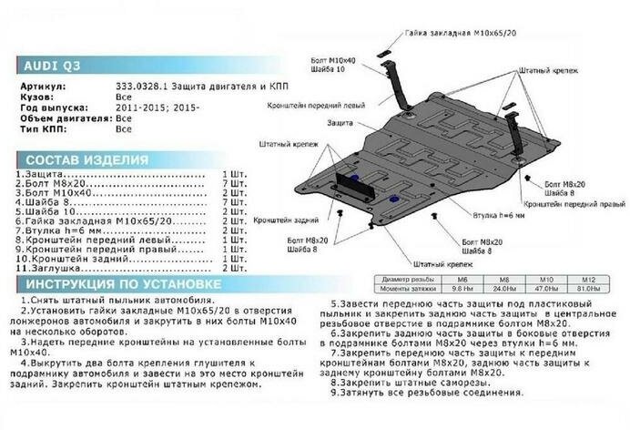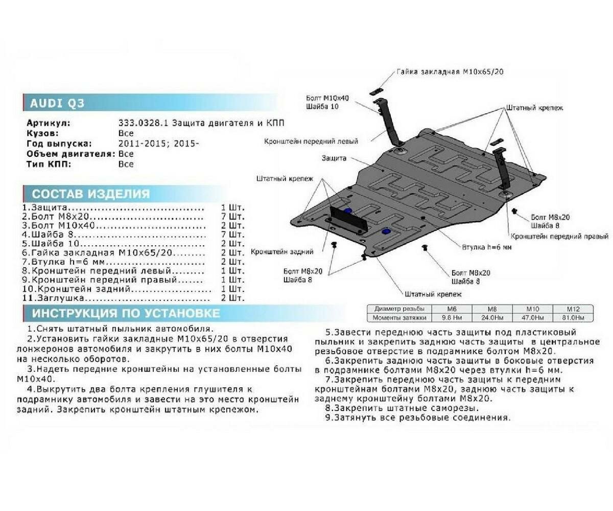 Защита картера и КПП Rival для Audi Q3 2011, V-2.0; 2.0d, алюминий 4 мм., комплект крепежа,