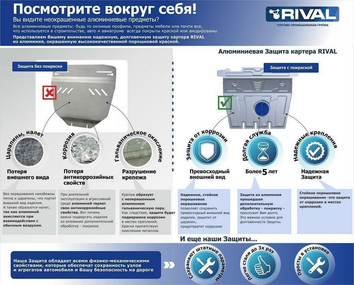 Алюминиевые защиты Rival надежно защищают днище вашего автомобиля от повреждений, например при наезде на бордюры, а также выполняют эстетическую функцию при установке на высокие автомобили.