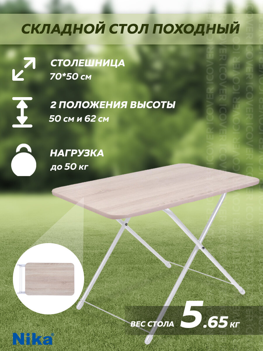 NIKA NK020 - удобный складной стол для дачи и пикников. Данная модель имеет возможность регулировки высоты с двумя фиксированными значениями на 500 и 620 мм. Стол в сложенном виде занимает минимум места. Прочная и надёжная ламинированная древесно-стружечная плита является оптимальным решением в качестве столешницы.