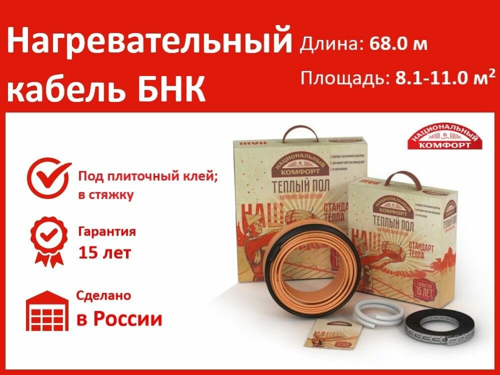 Теплые полы бренда «Национальный комфорт» БНК-1210 используются в целях обеспечения комфортного температурного режима в самых разных помещениях (комнаты в загородных и многоквартирных домах, в офисах, детских садах, административных помещениях и др.). Двужильный греющий кабель обладает длиной 68 метров и номинальной мощностью 1210 Вт. Бетонная стяжка, в которой раскладывается секция, должна быть 30-50 мм толщиной (рекомендуется устанавливать слой теплоизоляции).