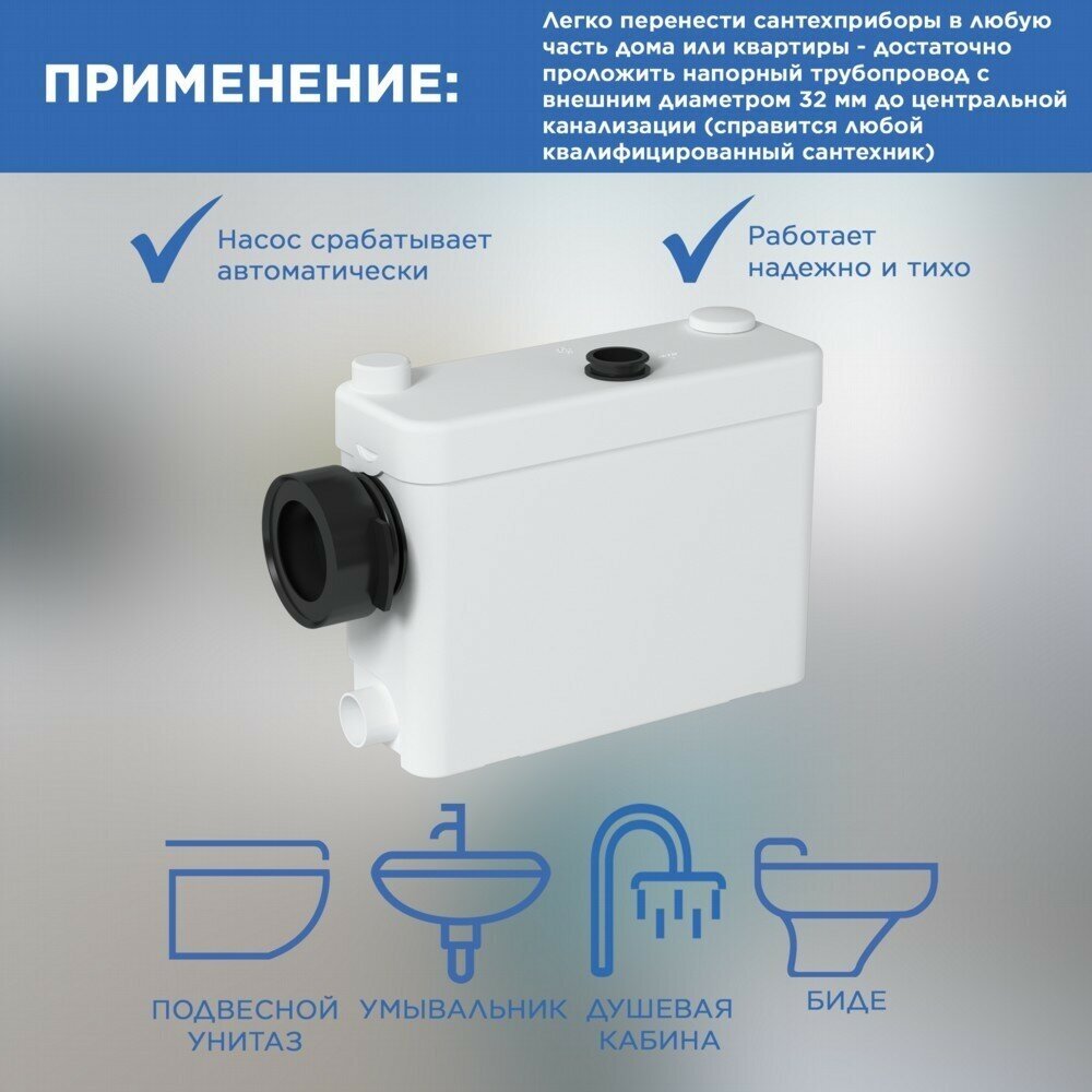 Дополнил таким насосом систему навесного унитаза и очень доволен результатом. В конструкции есть и обратный клапан и измельчитель. Устанавливается скрытно, гармонию интерьера абсолютно ничем не нарушает. Откачивает тихо, запахи тоже не пропускает. Шикарное решение для частного дома.