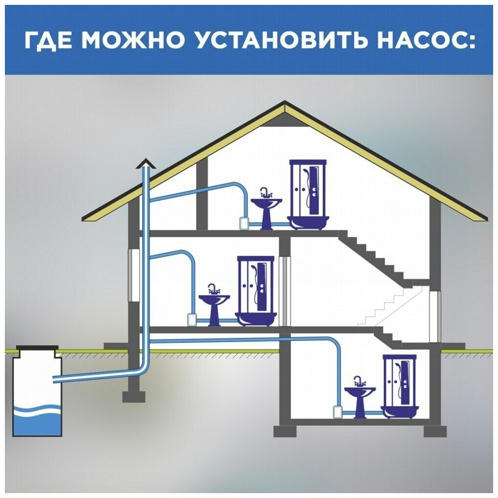 С помощью этого насоса можно оборудовать вполне полноценную систему канализации в доме, где таковая не предусмотрена: это оборудование отводит сточные воды на 4 метров по вертикали и 40 метров по горизонтали, причем, трубы отвода стока могут иметь изгибы, подниматься и опускаться на любой уровень. Такое довольно большое расстояние позволяет вывести канализационную трубу из дома прямиком в сточную яму.