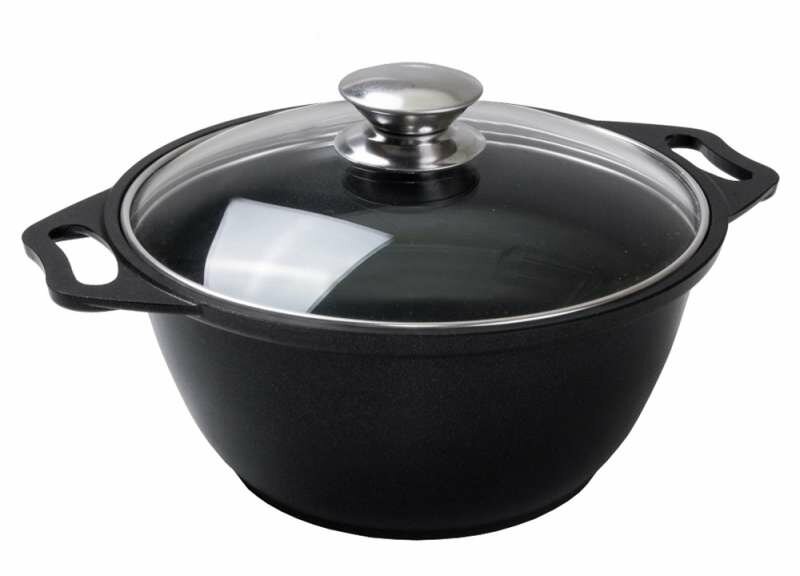 Кастрюли с антипригарным покрытием производства ОАО "Кукморский завод Металлопосуды" (Республика Татарстан). Основа кастрюль - толстостенный литой алюминий, что обеспечивает долгий срок службы и высокую прочность посуды.