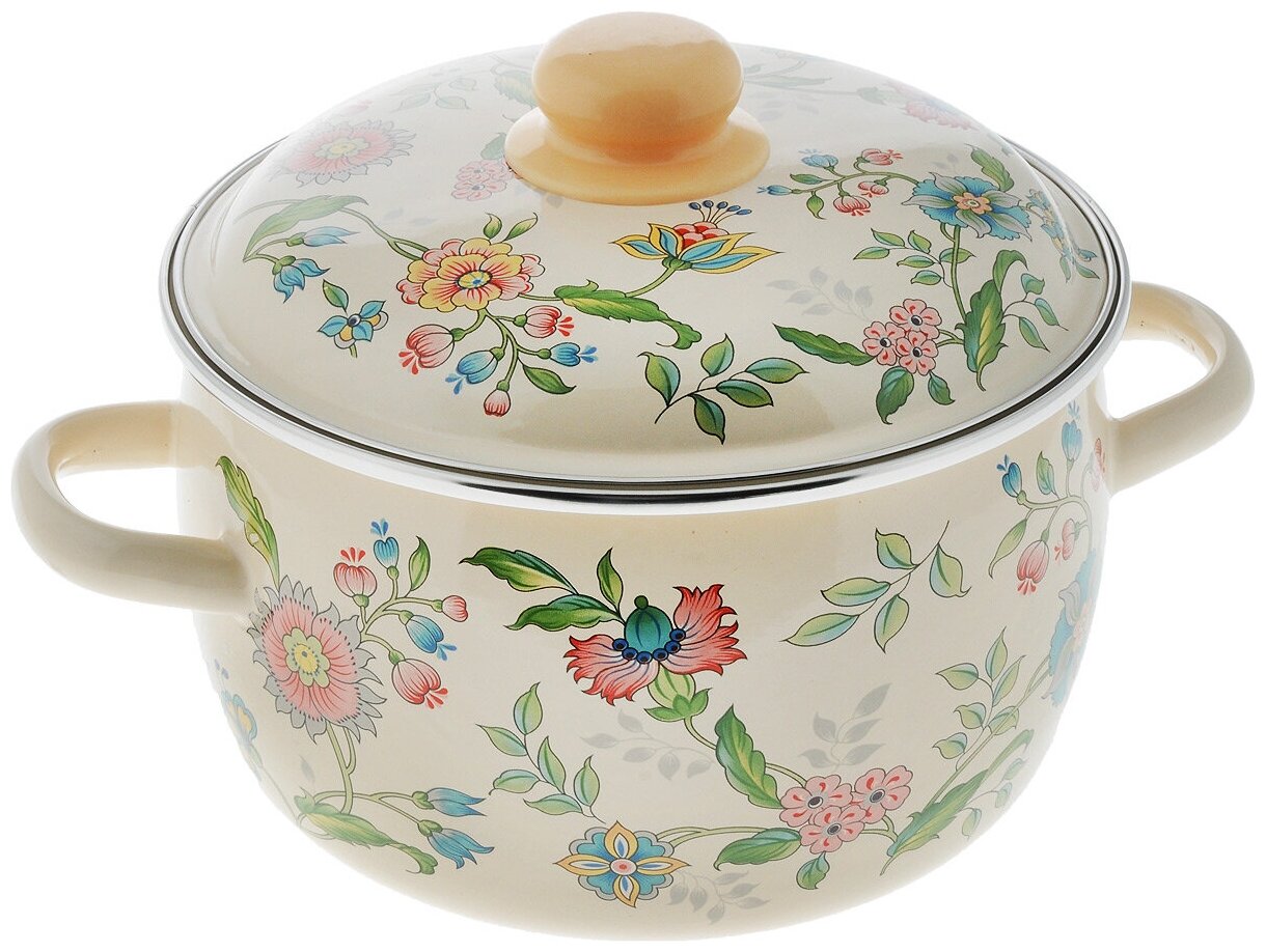 Кастрюля эмалированная СтальЭмаль Луговые цветы выполнена из высококачественного стального проката, покрытого двумя слоями жаропрочной эмали. Такое покрытие защищает сталь от коррозии, придает посуде гладкую стекловидную поверхность и надежно защищает от кислот и щелочей. Эмаль не вступает во взаимодействие с продуктами и не искажает их вкусовые качества. Прочный стальной корпус обеспечивает эффективную тепловую обработку пищевых продуктов и не деформируется в процессе эксплуатации.