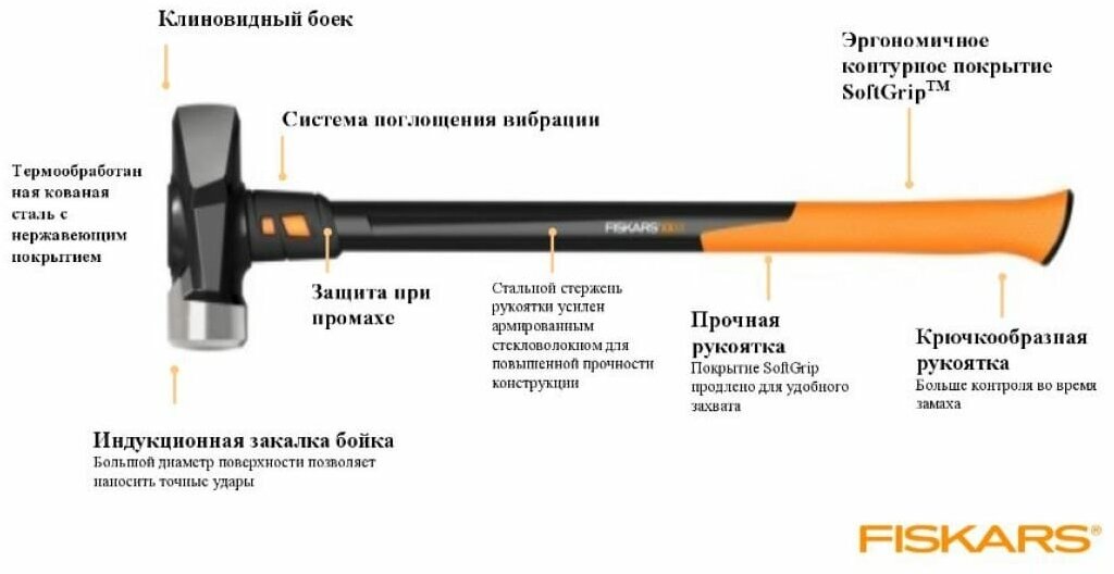Большая кувалда Fiskars 8 lb/36" оснащен клиновидным бойком, который изготовлен из кованой стали и прошел термическую обработку, а еще имеет нержавеющее покрытие. Прочность конструкции также поддерживает еще одна особенность - стальной стержень рукоятки усилен армированным стекловолокном. Всё это способствует долгому сроку службы инструмента. Покрытие SoftGrip препятствует скольжению руки во время работы.