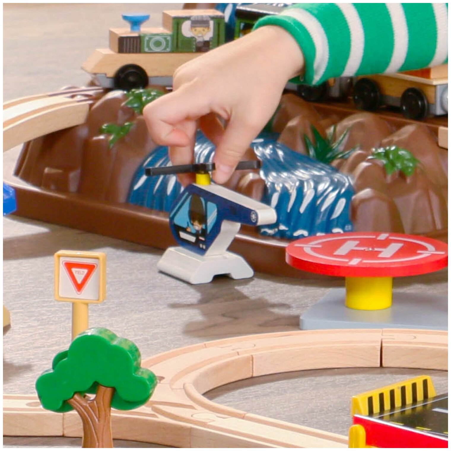 | Комплектация | полотно железной дороги; поезд с двумя вагонами; гора с водопадами и озером; аэропорт; полицейский участок; фигурки людей; фигурки деревьев; транспорт |