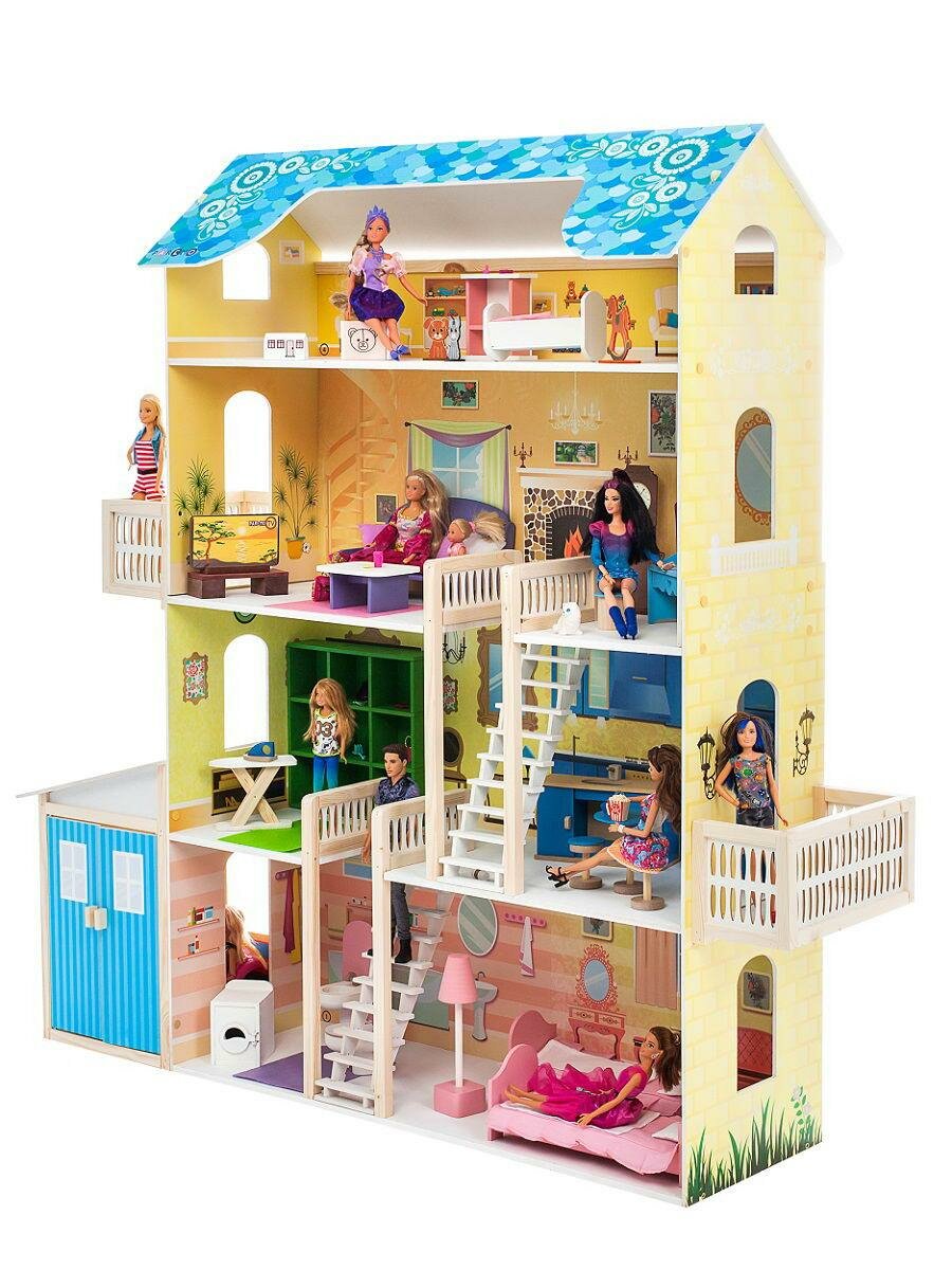 - Особенность: нестандартное цветовое решение делает домик визуально легким и солнечным. Впечатляющая комплектация аксессуарами, 4 этажа, флокированные лестницы, 2 балкона и вместительный гараж создают идеальное игровое пространство даже если в игре участвует несколько детей. Сделано в России!