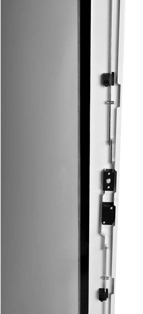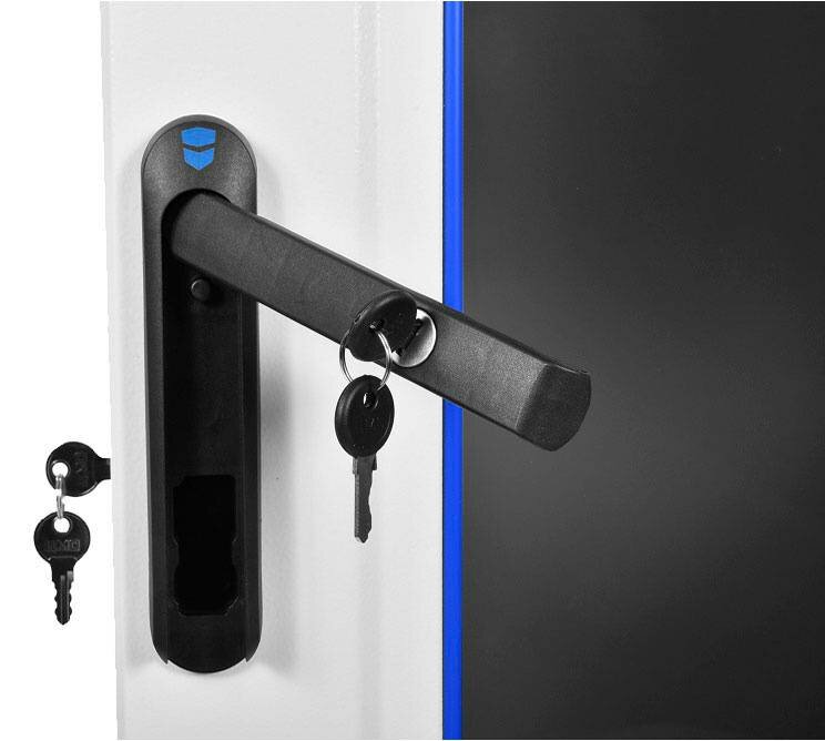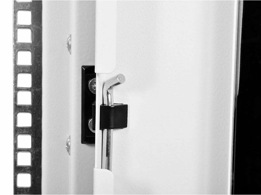 Шкафы комплектуются задней металлической стенкой и дверью с тонированным ударопрочным стеклом. Дверь фиксируется усиленным точечным замком. Двери имеют как правую, так и левую навеску.