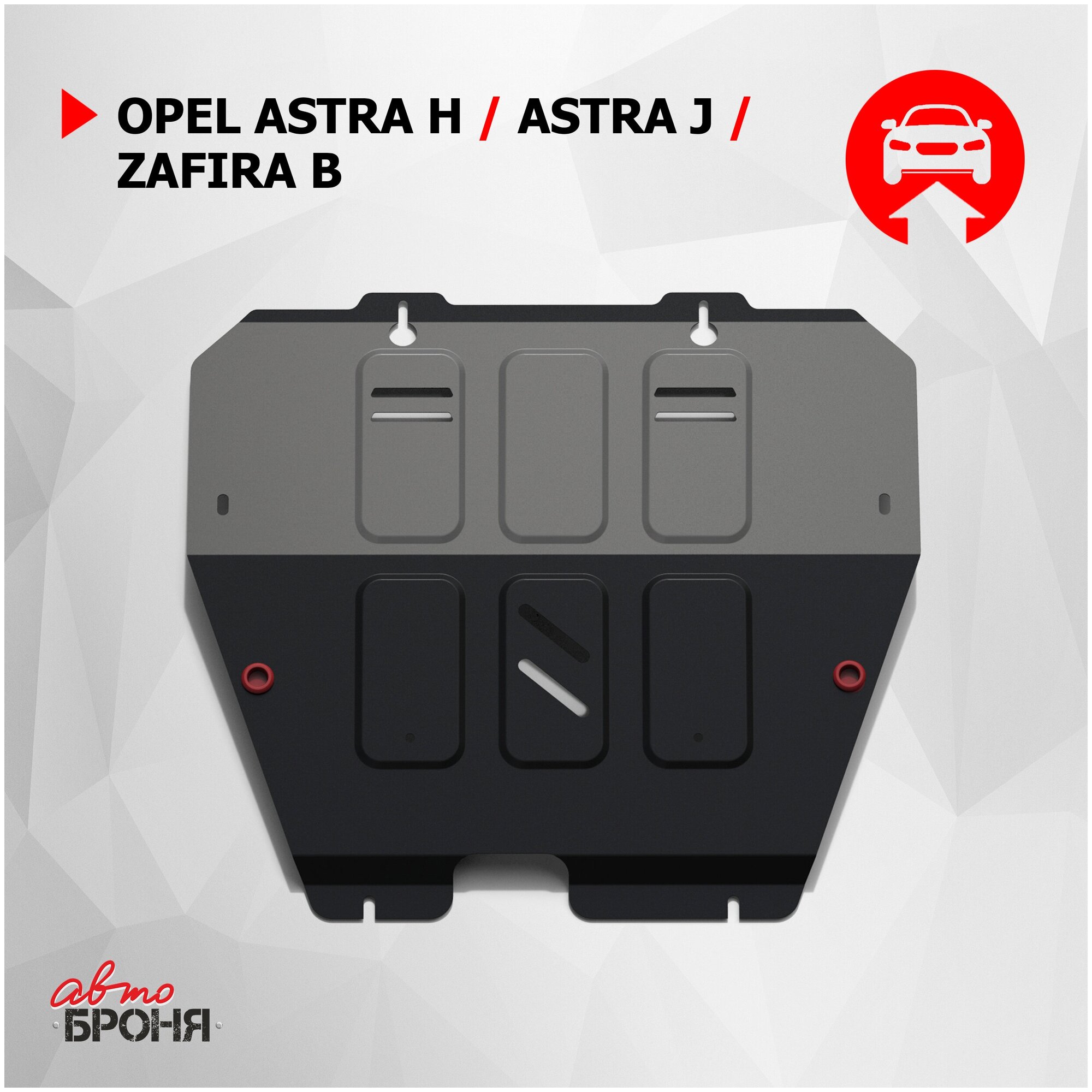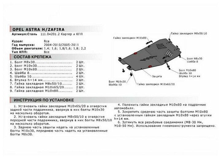 Защита картера и КПП Автоброня для Opel Astra Family, V - 1,4; 1,6; 1,8 2012Opel Astra H, V - 1,4; 1,6; 1,8 2004-2009Opel Zafira, V - 1,6; 1,8; 2,2 2005-2011, сталь 2 мм., комплект крепежа,