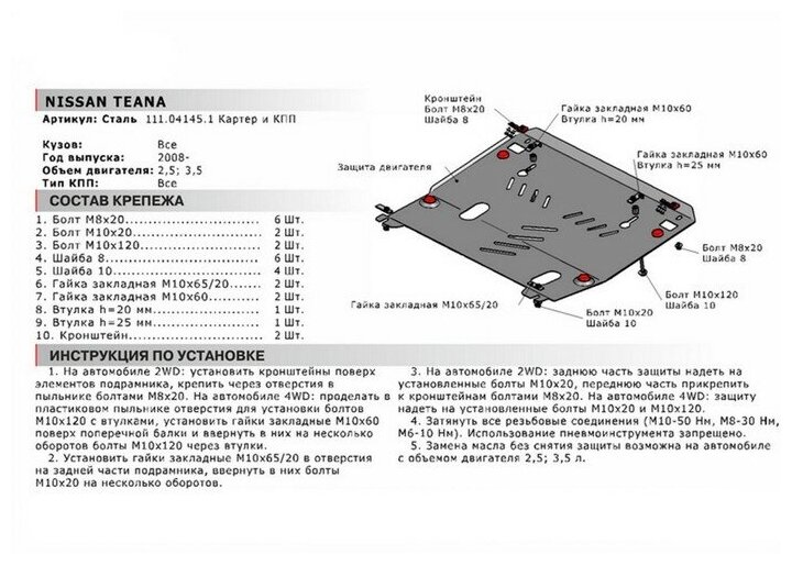 Защита картера и КПП Автоброня Nissan Teana, V - 2,5; 3,52WD, 4WD 2008, сталь 2 мм., комплект крепежа,