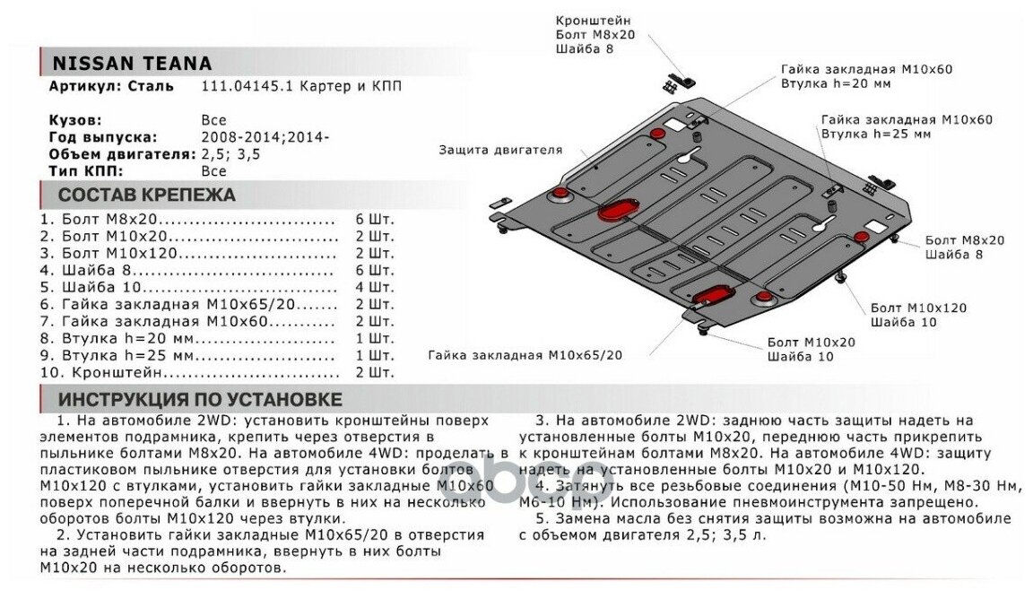 | Комплектация | защита - 1 шт., комплект крепежа, инструкция по установке, упаковка |