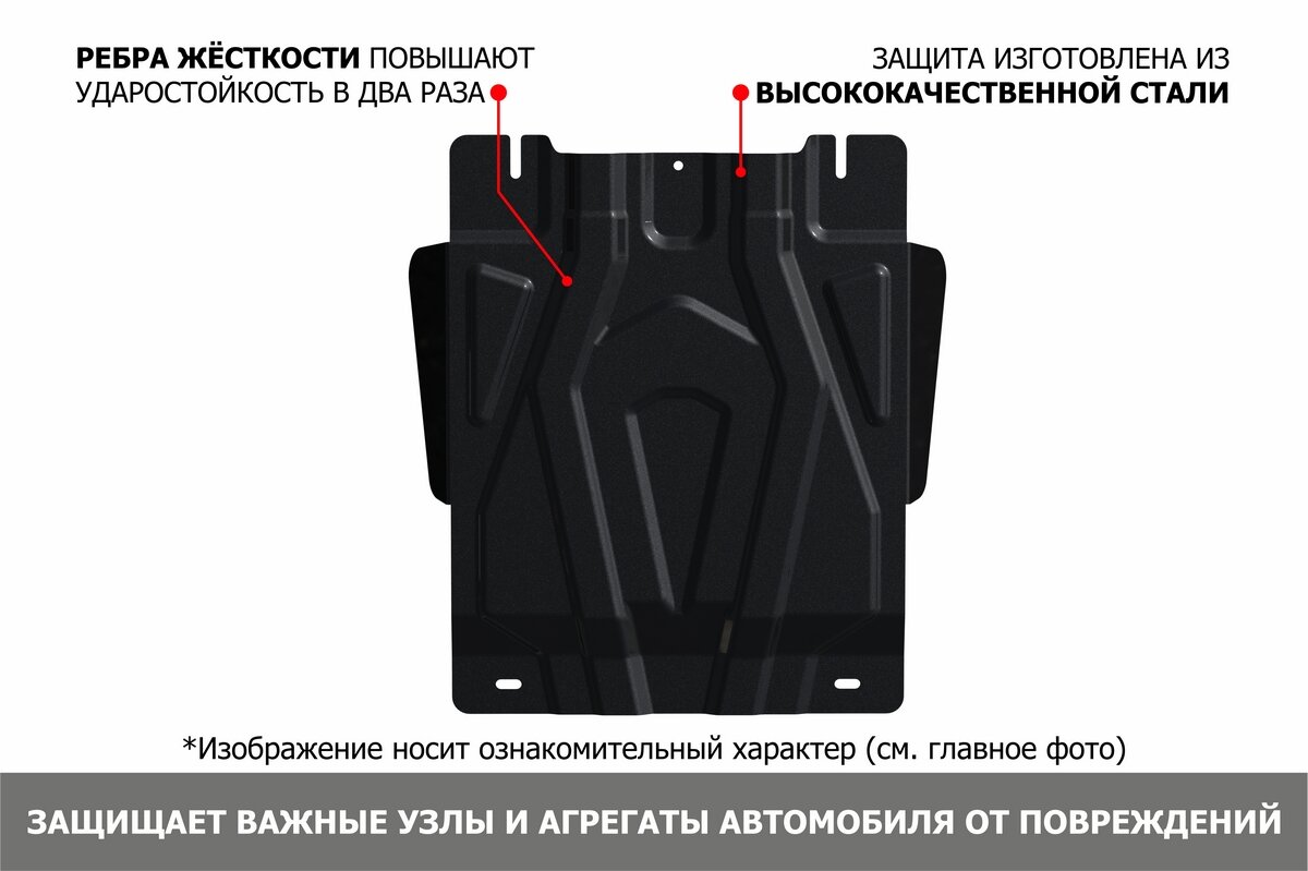 Обращаем ваше внимание, на тот факт, что защита имеет форму, соответствующую модели данного автомобиля. Наличие глубокого штампа и лючков для смены фильтровмасла предусмотрено не на всех защитах. Фото служит для визуального восприятия товара.