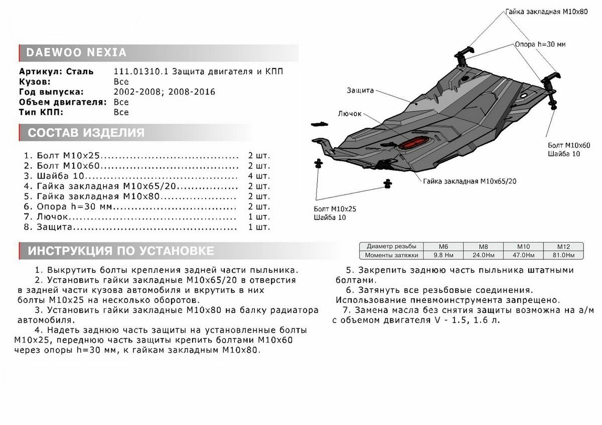 Защита картера и КПП Автоброня Daewoo Nexia 2008, сталь 2 мм., комплект крепежа,