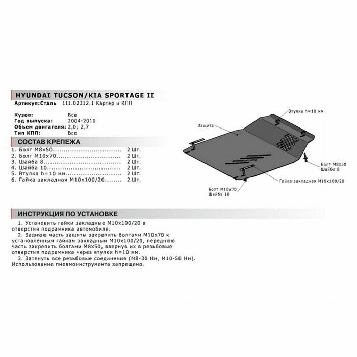 Защита картера и КПП Автоброня для Hyundai Tucson, V - 2,0; 2,7 2004-2010Kia Sportage, V - 2,0; 2,7 2004-2010, сталь 2 мм., комплект крепежа,