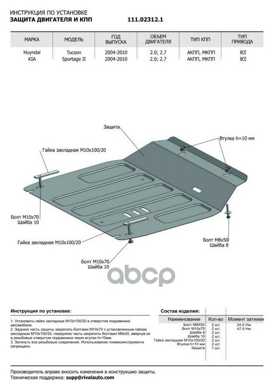 | Комплектация | защита - 1 шт., комплект крепежа, инструкция по установке, упаковка |