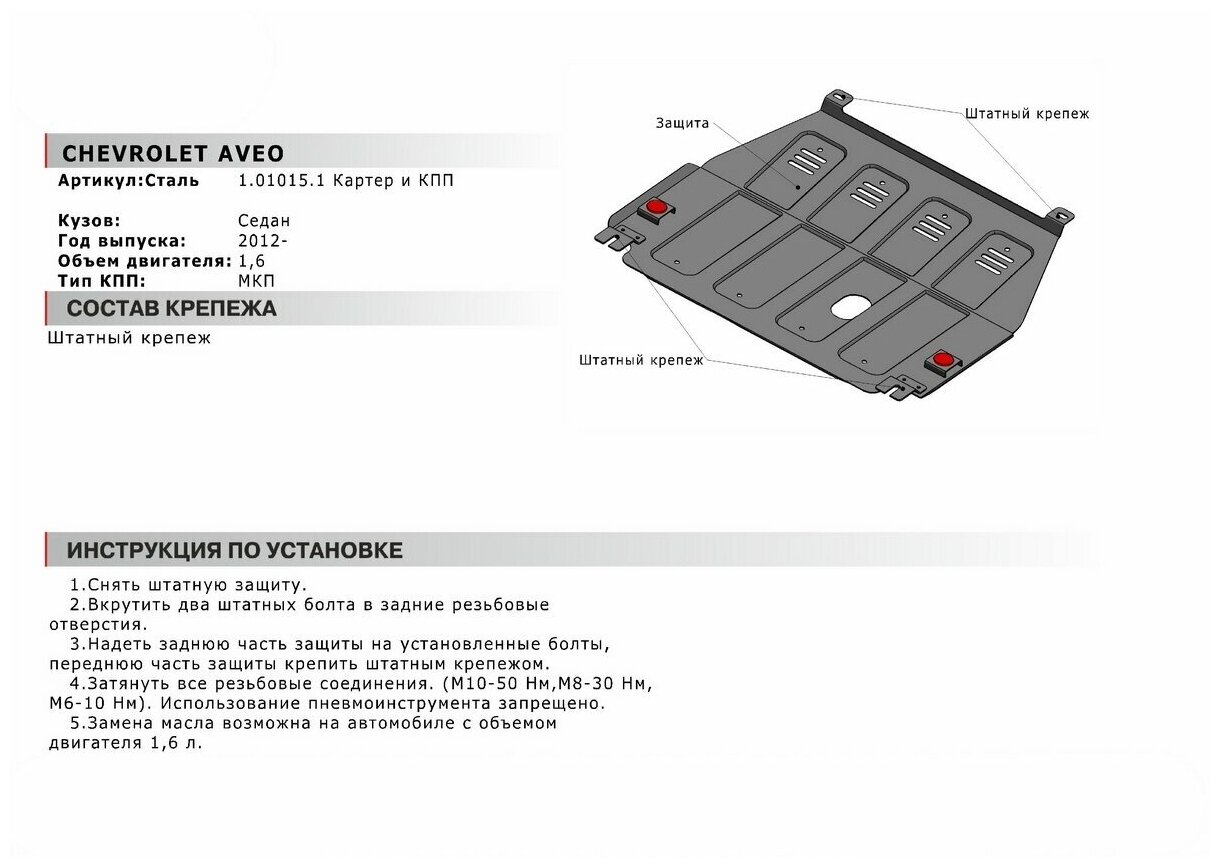 Защита картера и КПП Автоброня Chevrolet Aveo, МКПП, V - 1,6 2012, сталь 2 мм., штатный крепеж,