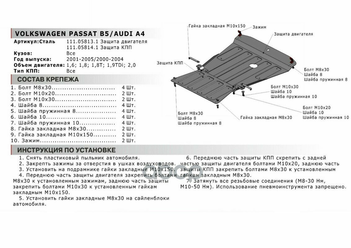 Защита картера Автоброня для AUDI A4, V - 1,6; 1,8; 1.8T; 1.9TDi; 2,0 2000-2004Volkswagen Passat B5, V - 1,6; 1,8; 1.8T; 1.9TDi; 2,0 2001-2005, сталь 2 мм., комплект крепежа,