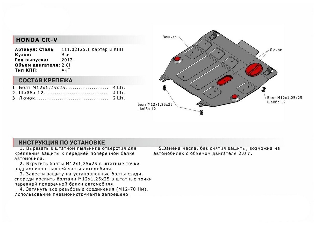 Защита картера и КПП Автоброня Honda CR-V, V - 2,0 i 2012, сталь 2 мм., комплект крепежа,