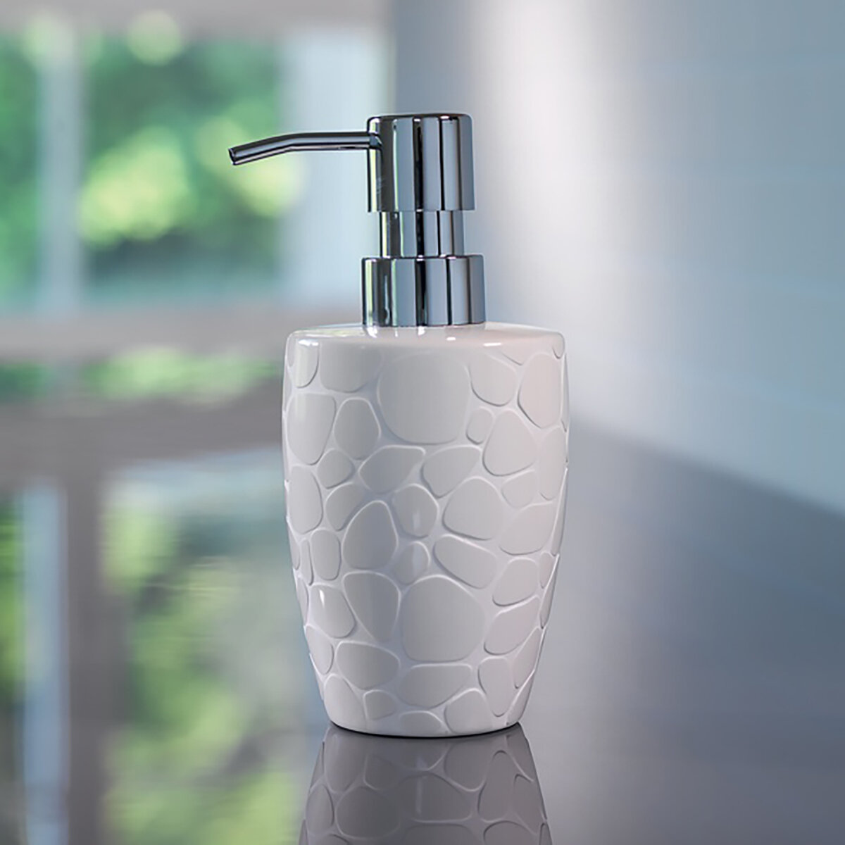 Этот красивый дозатор станет настоящим украшением для Вашей ванной комнаты. Его необычный дизайн и материал, который создает визуальный песчаный эффект, создадут у Вас в ванной оригинальную атмосферу, подчеркнув общий дизайн Вашей ванной комнаты. Изделие белого цвета отличается еще и перламутровым отливом.