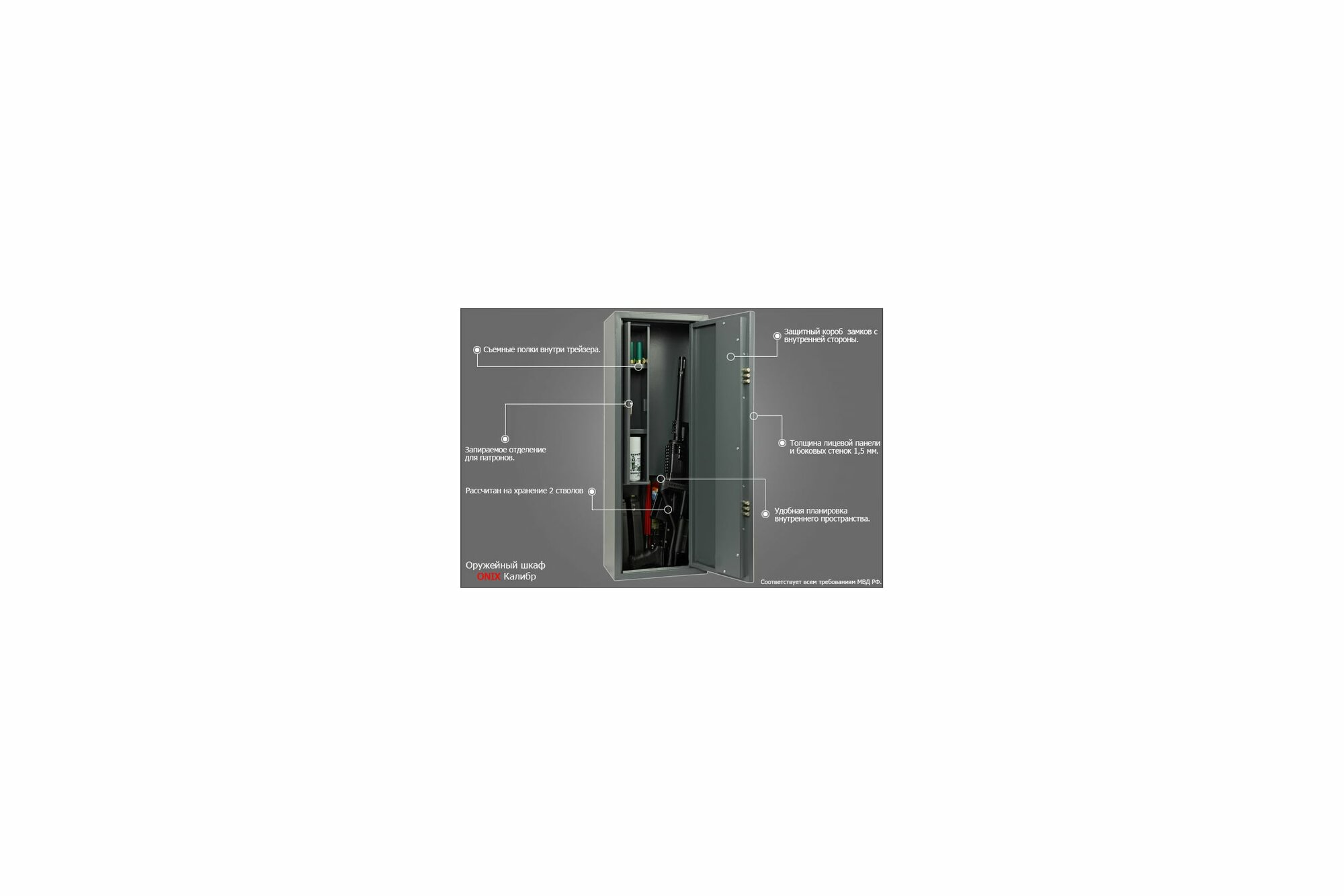 Шкаф оружейный Onix Калибр. Согласно действующему российскому законодательству, огнестрельное оружие должно храниться надлежащим образом. Владельцам оружия необходимо обеспечить условия его хранения - исключающие доступ к нему посторонних лиц. Для безопасного и надежного хранения оружия предназначены специальные оружейные шкафы. Боеприпасы и порох должны храниться отдельно от оружия, в запирающемся ящике. Требование к отдельному хранению боеприпасов может быть удовлетворено, если выбрать модель шкафа, оборудованную запираемым патронным отделением (трейзером).