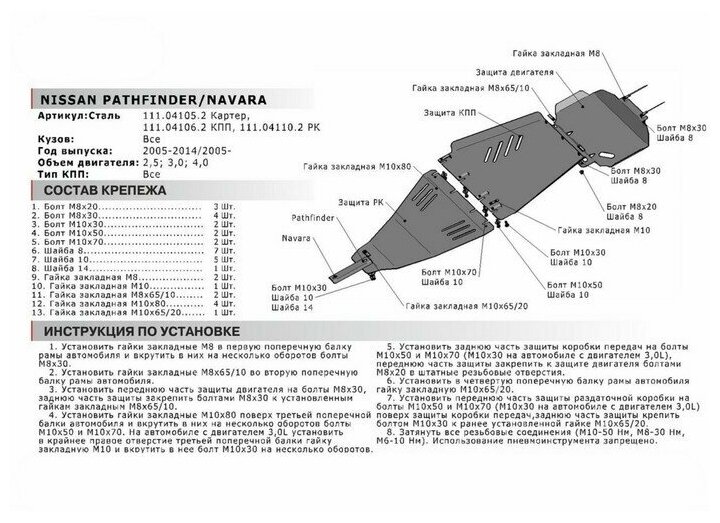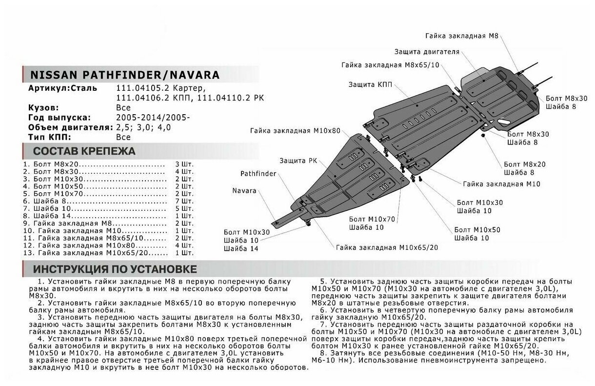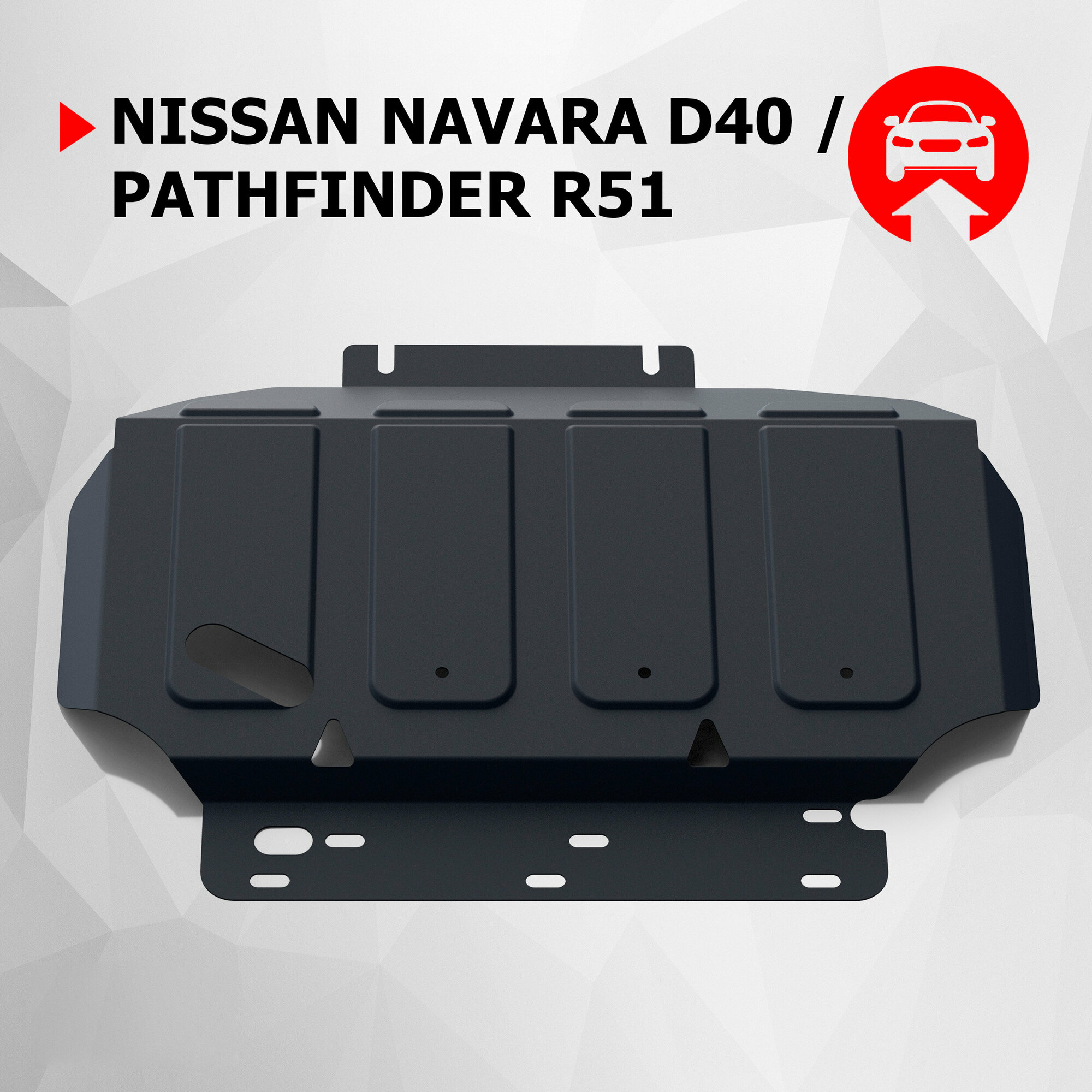 Защита картера Автоброня для Nissan Navara, V - 2,5; 3,0; 4,0 2005Nissan Pathfinder, V - 2,5; 3,0; 4,0 2005-2014, сталь 2 мм., комплект крепежа,