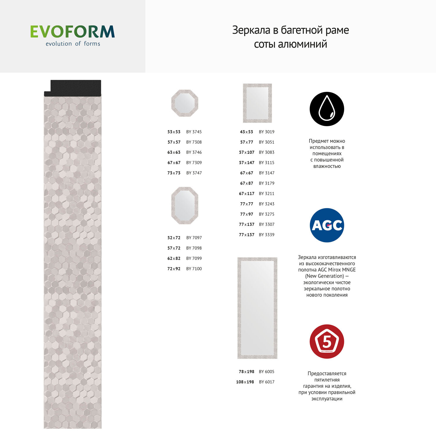 AGC Glass. Зеркала изготавливаются из высококачественного полотна AGC Mirox MNGE (New Generation)— экологически чистое зеркальное полотно нового поколения. Основные свойства багета: низкая теплопроводность, низкое водопоглощение, низкая паропроницаемость, высокая прочность на сжатие, морозостойкость, стойкость к горению, стойкость к билогическому разложению (гниению), экологическая чистота (не токсичен), долговечность, малый вес