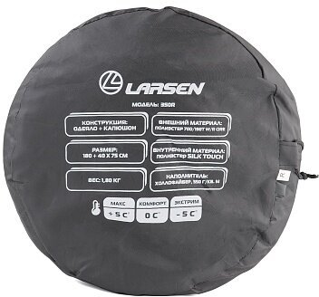 Спальный мешок Larsen 350 имеет прямоугольную форму и застегивается с помощью молнии. Имеет удобный капюшон. Спальный мешок обеспечивает лучшую изоляцию от холода, чем обычное одеяло, а также дополнительную амортизацию. Для лучшей теплоизоляции и амортизации обычно лучше всего расположить на коврике.