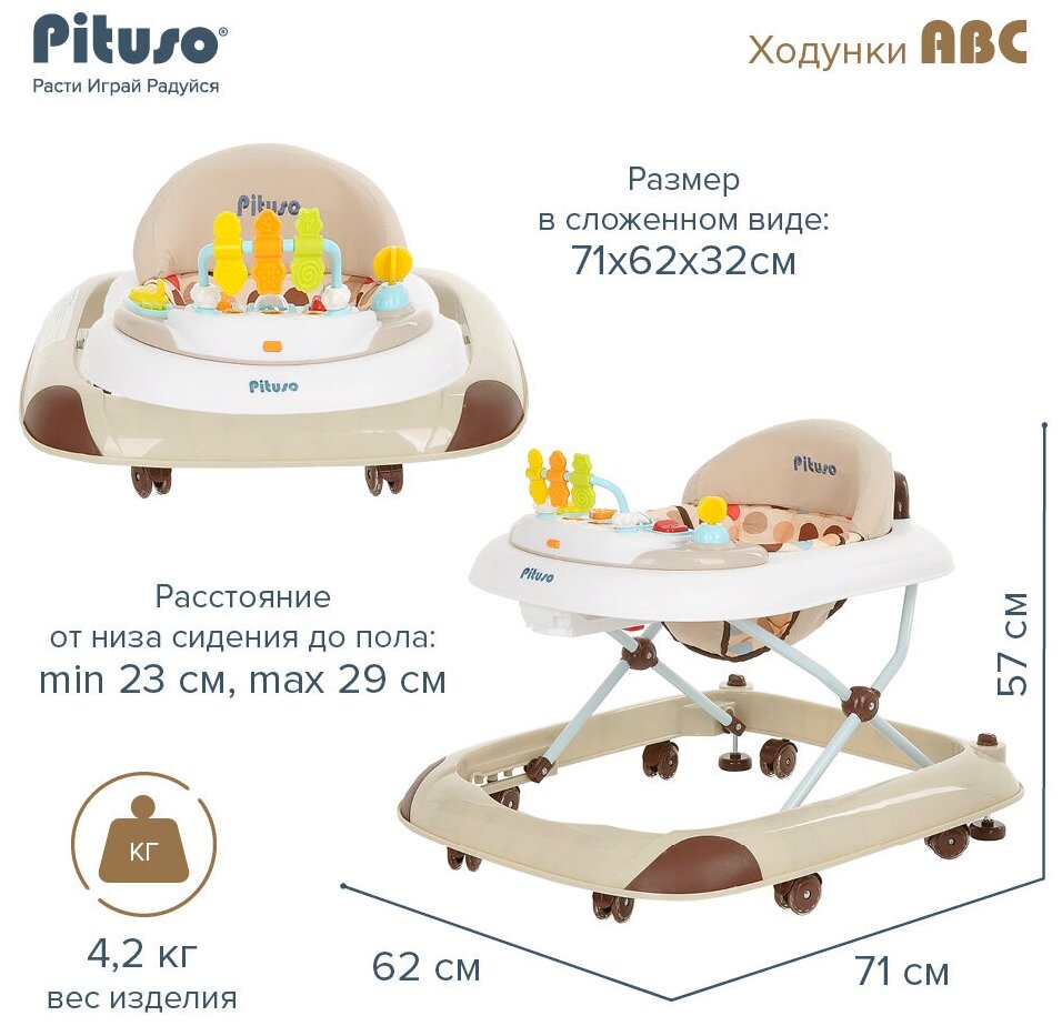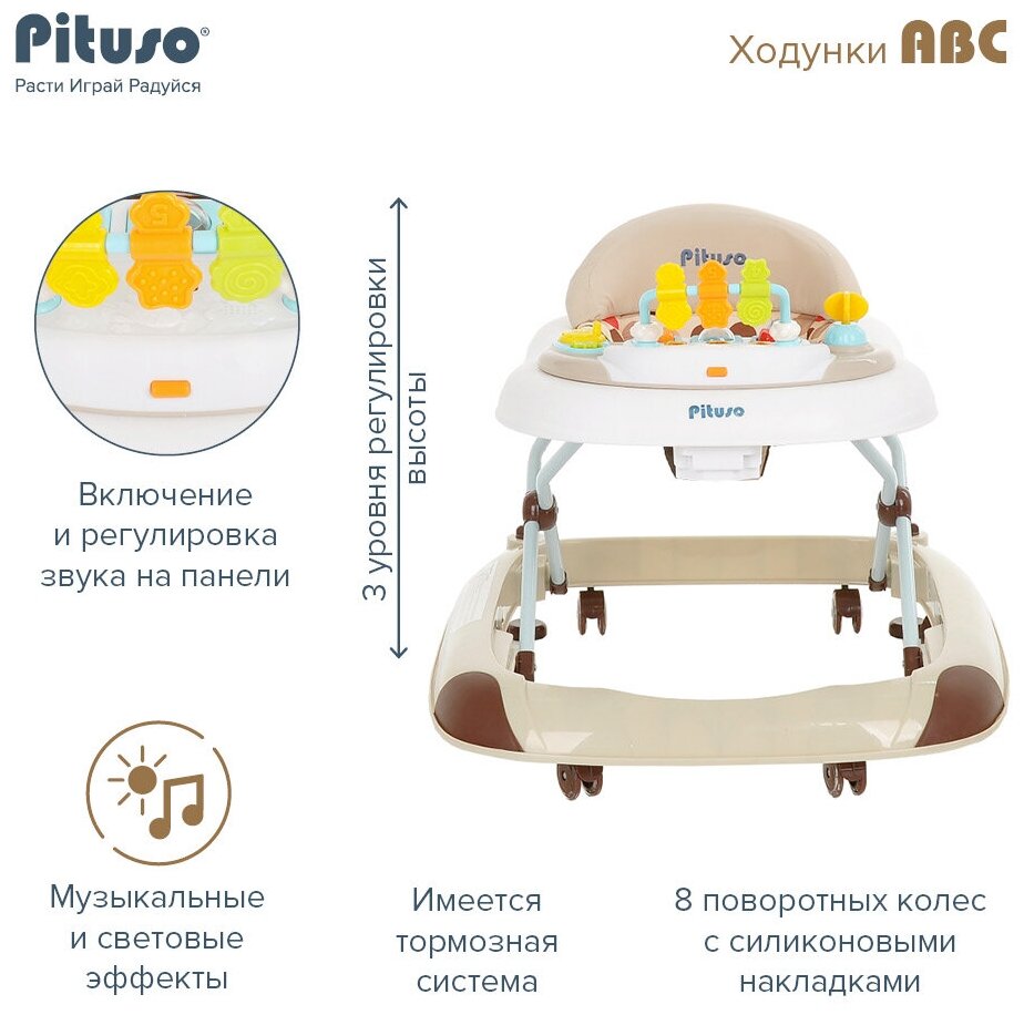 Ходунки-качалка Pituso ABC буковки позволят ребенку научиться ходить, при этом они будут регулироваться по высоте в трех положениях. Звуковые эффекты на игровой панели, а также огоньки и кнопки привлекут внимание ребенка и позволят ему играть и обучаться сенсорным навыкам. Также ходунки можно использовать в качестве столика для кормления малыша, благодаря функциональному лотку.