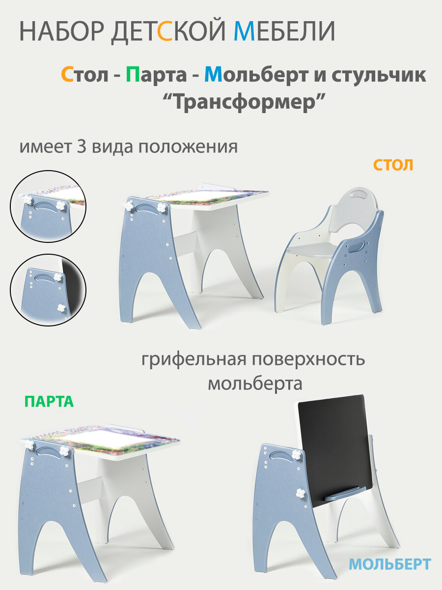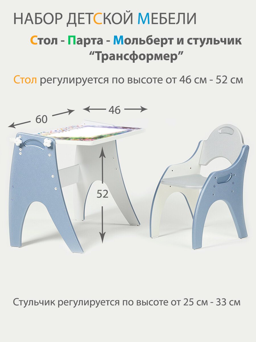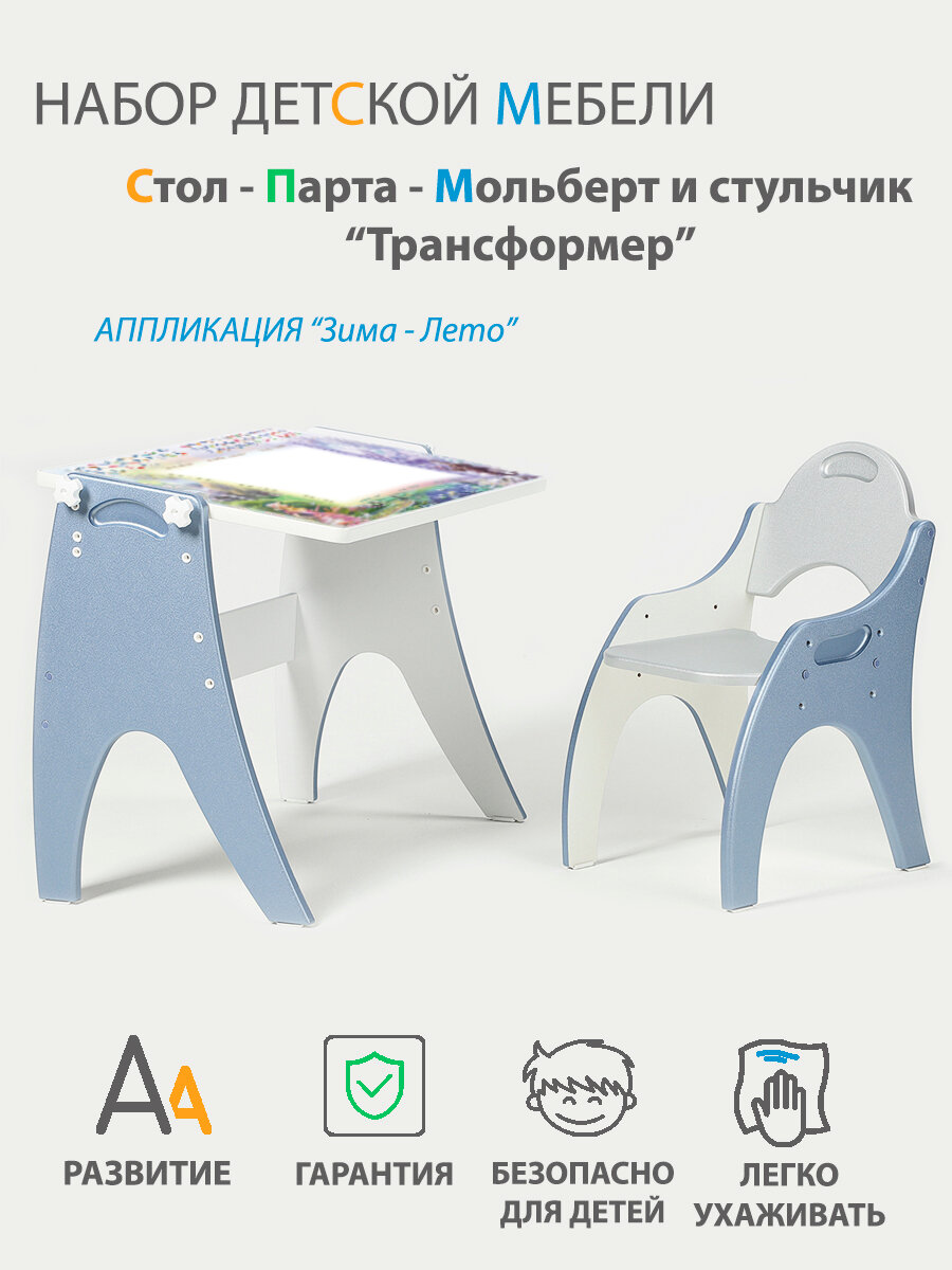 Набор детской мебели Трансформер состоит из двух предметов: • парта - мольберт (трансформер);• стульчик (регулируется по высоте). Парта - мольберт имеет механизм трансформации, который позволяет превращать в парту наклоном столешницы, в мольберт и наоборот. Поворот и фиксация осуществляется при помощи эстетичных барашков. Столешница парты имеет с одной стороны поверхность для использования маркеров на водной основе, а с другой, в положении мольберт - грифельная или магнитная поверхность. • Наш детский стол и стул устойчивы в использовании, формируют правильную осанку и берегут зрение ребёнка, т.к. сделаны в строгих нормативах ГОСТ под каждый диапазон роста малыша: 100 - 115 см (нижнее положение стола и стула); • 116 - 130 см (верхнее положение стола и среднее стула); Аппликация на столешнице "Зима - Лето" содержит образовательную информацию в виде букв русского и английского алфавита, времена года и месяцы в русском и английском исполнении.