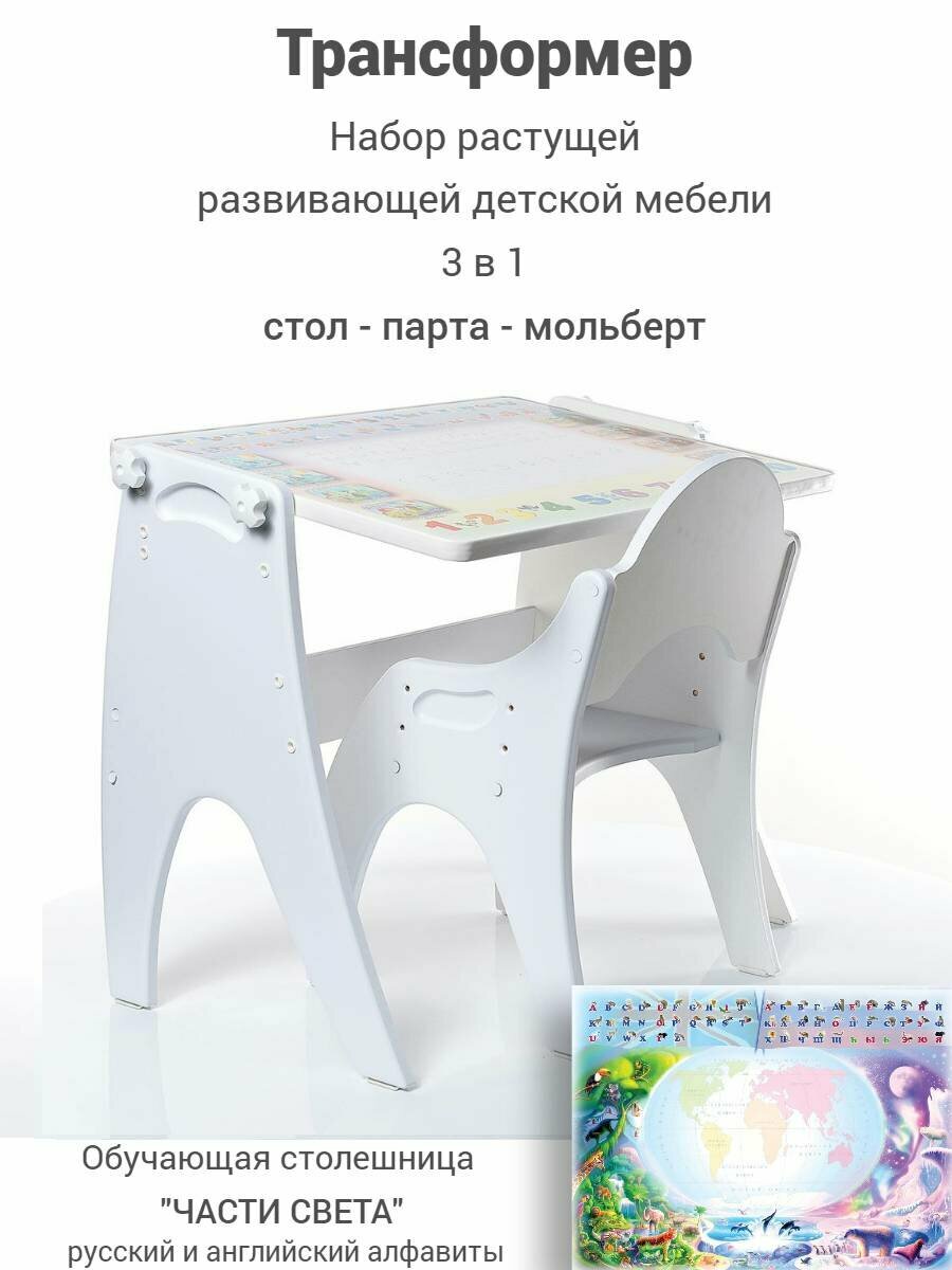 Набор детской развивающей мебели "Трансформер" 3 в 1 состоит из двух предметов - столик и стульчик, которые регулируются по высоте. Столик имеет механизм трансформации, который позволяет превращать стол в парту, с наклоном столешницы, а также в мольберт и наоборот. Поворот и фиксация осуществляется с помощью барашков. Парта с одной стороны покрыта ламинированной обучающей поверхностью с аппликацией "ЧАСТИ СВЕТА", а с другой стороны имеет меловую доску. На поверхности стола можно рисовать водными маркерами, а на поверхности мольберта - мелом и играть " в школу" или "садик". Подходит для детей ростом от 98-130 см. "Трансформер" - идеальный подарок для мальчиков и девочек, который долго прослужит им, доставляя постоянную радость.