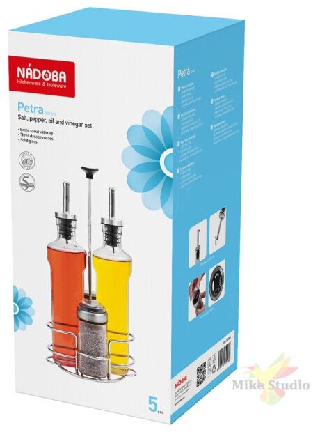Набор включает: бутылка для уксуса, 350 мл.; бутылка для растительного масла, 350 мл.; ёмкости для специй, 2 шт. х 80 мл.; подставка из хромированной стали.