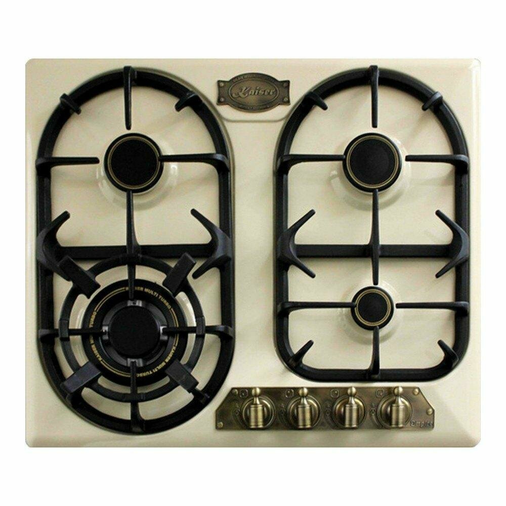 Округлая форма решеток необычно смотрится, Kaiser KG монтируется в любую поверхность, газовая панель намного практичнее других типов подключений. Поворотные выключатели выполнены в необычном стиле, одна из 4-х конфорок трех контурная, размеры не большие. Панель с бежевым покрытием очень маркая, протираю от жира почти каждый день. Готовить на ней приятно, чувствую себя хозяйкой большого замка.