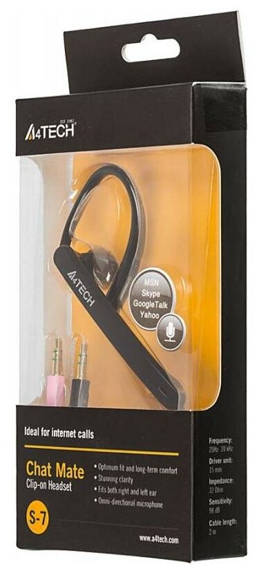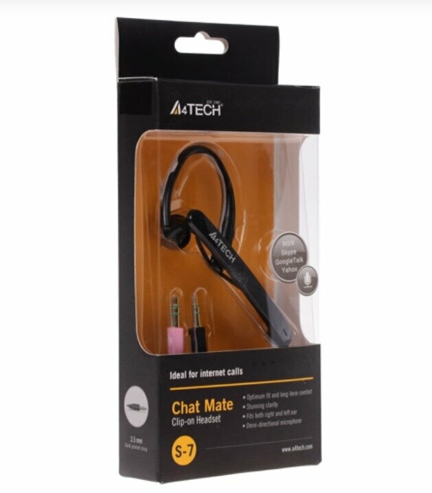 Чёрного цвета наушники A4Tech S-7 представляют собой моногарнитуру, с ней будет комфортно вести беседы и параллельно справляться с домашними делами, прогуливаться по улицам города или для решения рабочих моментов. Для подключения устройства предусмотрен разъём 3.5 мм, что очень удобно при необходимости подсоединения гарнитуры к портативному устройству. Длина кабеля в 2 метра гарантирует возможность включения даже в том случае, если вы вынуждены находиться на значительном расстоянии от точки подключения.