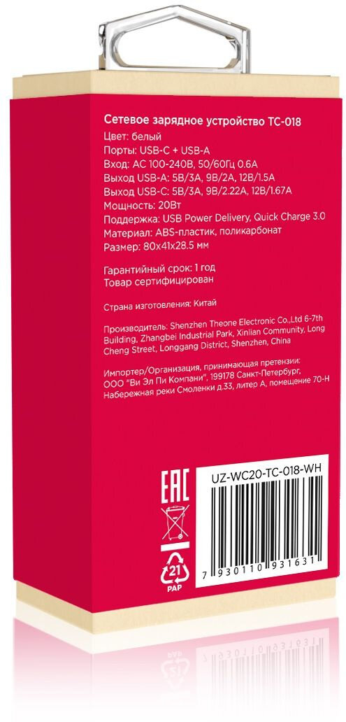 Сетевое зарядное устройство в корпусе из качественного пластика обеспечивает безопасный и быстрый заряд. Максимальная мощность 20 Вт, два порта питания- USB-A и USB-C позволяют заряжать два устройства одновременно. Поддерживает актуальные протоколы быстрой зарядки - USB Power Delivery, QuickCharge 3.0. Оснащено интеллектуальной системой распределения мощности Smart IC - самостоятельно определяет подключенное устройство и автоматически выбирает наиболее быстрый и безопасный режим зарядки. Обеспечивает защиту от перегрева, короткого замыкания, превышения напряжения и тока.