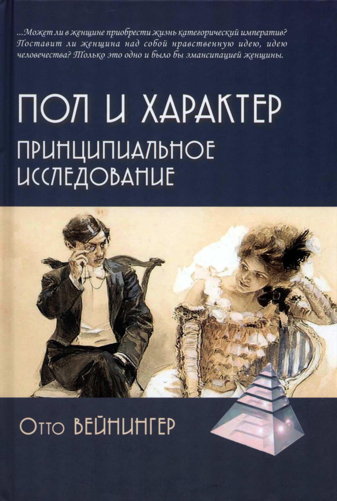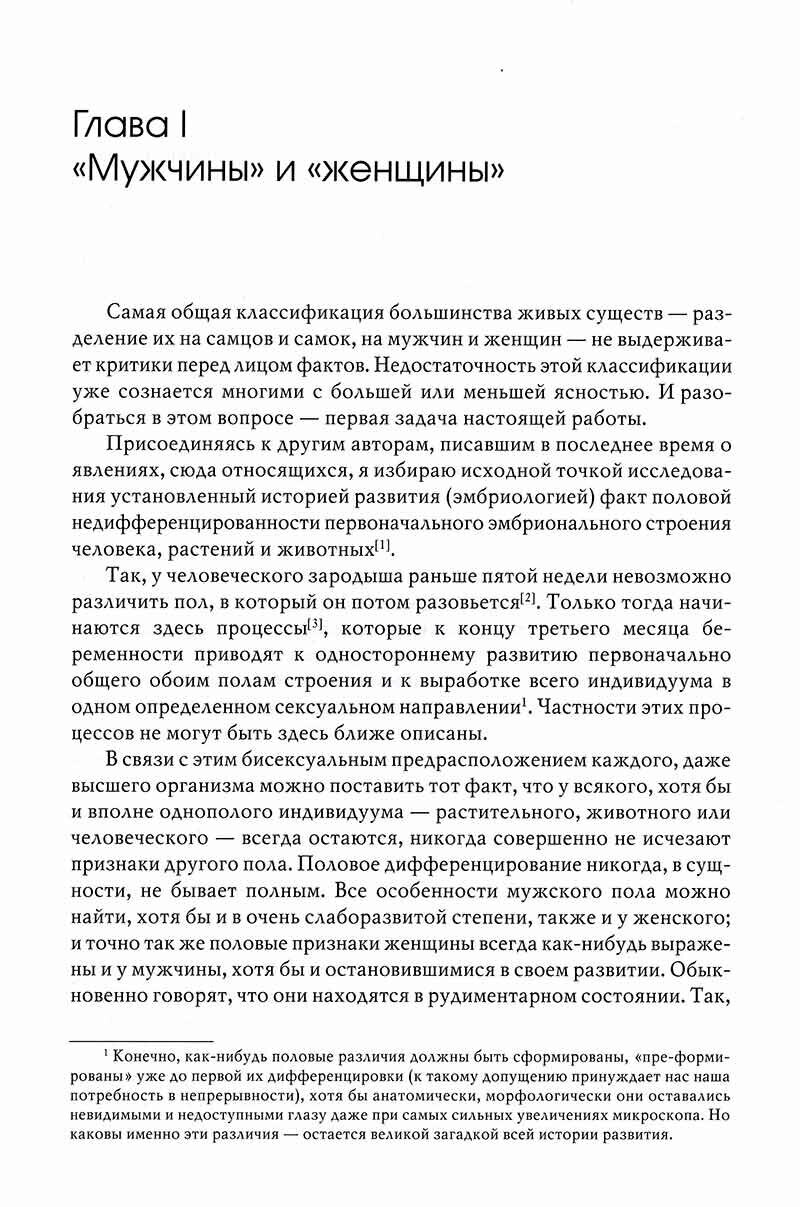 "Пол и характер" Отто Вейнингера (1880-1903) - знаменитое философско-психологическое исследование, создатель которого сломал все ранее существовавшие гендерные стереотипы и задался вопросом, какое же место занимают в мироздании мужчина и женщина. Австрийский философ пришел к выводу, что вопрос этот касается прежде всего каждого отдельного человека. Ему открылась бисексуальность человеческого существа как физиологически заданное природой свойство и, что еще более важно, норма психики: все особенности мужского пола, хотя и в слабом, едва развитом состоянии, можно найти и у женского; и наоборот, признаки женщины в своей совокупности содержатся в мужчине, хотя и в очень неоформленном виде. Была выделена одна из базовых структур психики?- единство мужского и женского в ней. И это задолго до архетипов Юнга, до работ по гендерной проблематике, до фундаментальных открытий биологии конца второго тысячелетия.