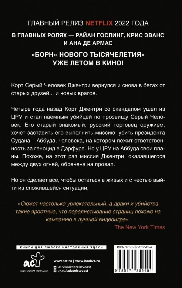 Четыре года назад Корт Джентри со скандалом ушел из ЦРУ и стал наемным убийцей по прозвищу Серый Человек. Его старый знакомый, русский торговец оружием, хочет заставить его выполнить миссию: убить президента Судана - Аббуда, человека, на котором лежит ответственность за геноцид в Дарфуре. Но у ЦРУ на Аббуда свои планы. Похоже, на этот раз миссия Джентри, оказавшегося между двух огней, обречена на провал.