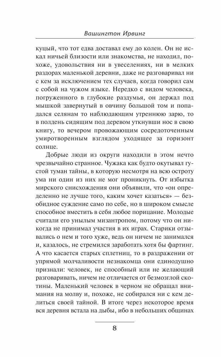 Вашингтон Ирвинг – американский писатель 19 века с множеством рассказов. В данный сборник вошли избранные произведения из книги эскизов или другое название «Записная книжка», два из «Брейсбридж-Холл», восемь из рассказов путешественника, а также один из «Сальмагунди». Обложка оформлена в твердом и полностью матовом переплете. Цвет страниц не белоснежный, но достаточно светлый для комфортного чтения. Шрифт четкий.