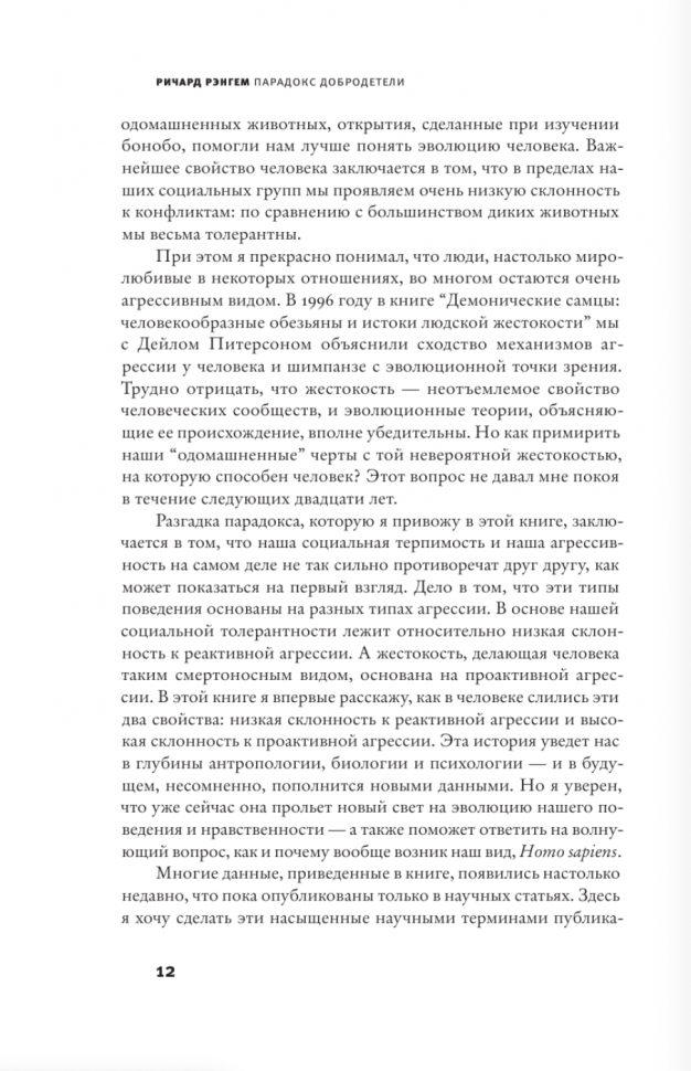 Традиционно в подобных дебатах господствовали две крайние точки зрения: мы от природы добры, но подвержены пагубному влиянию социума, или мы от природы злы, но нас сдерживают законы цивилизованного мира. Рэнгем смело отправляется туда, куда до него мало кто ступал, и доказывает, что этот спор не имеет смысла, так как мы суть и то, и другое.